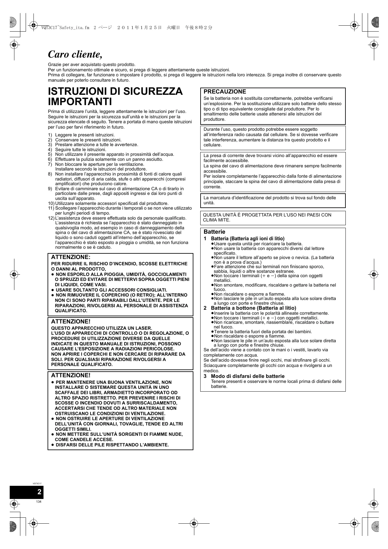 PRECAUZIONE Se la batteria non è sostituita correttamente, potrebbe verificarsi un’esplosione. Per la sostituzione utilizzare solo batterie dello stesso tipo o di tipo equivalente consigliate dal produttore. Per lo smaltimento delle batterie usate attenersi alle istruzioni del produttore. Durante l’uso, questo prodotto potrebbe essere soggetto all’interferenza radio causata dal cellulare. Se si dovesse verificare tale interferenza, aumentare la distanza tra questo prodotto e il cellulare. La presa di corrente deve trovarsi vicino all’apparecchio ed essere facilmente accessibile. La spina del cavo di alimentazione deve rimanere sempre facilmente accessibile. Per isolare completamente l’apparecchio dalla fonte di alimentazione principale, staccare la spina del cavo di alimentazione dalla presa di corrente. La marcatura d’identificazione del prodotto si trova sul fondo delle unità. QUESTA UNITÀ È PROGETTATA PER L’USO NEI PAESI CON CLIMA MITE.