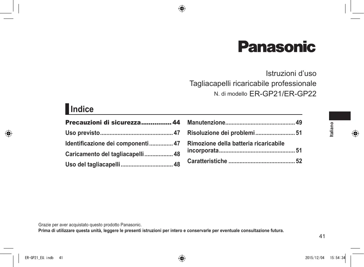 - 2015/12/04 15:54:34 Istruzioni d’uso Tagliacapelli ricaricabile professionale N. di modello ER‑GP21/ER‑GP22 Precauzioni di sicurezza p. 44