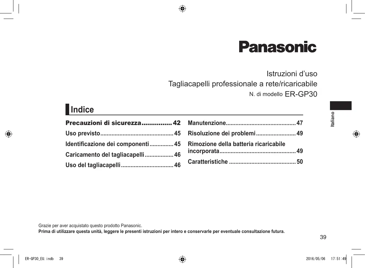 Scarica le istruzioni per il tuo Tagliacapelli in formato PDF gratuitamente! Trova il tuo manuale ER-GP30 - PANASONIC e riprendi in mano il tuo dispositivo elettronico. In questa pagina sono pubblicati tutti i documenti necessari per l'utilizzo del tuo dispositivo. ER-GP30 del marchio PANASONIC.