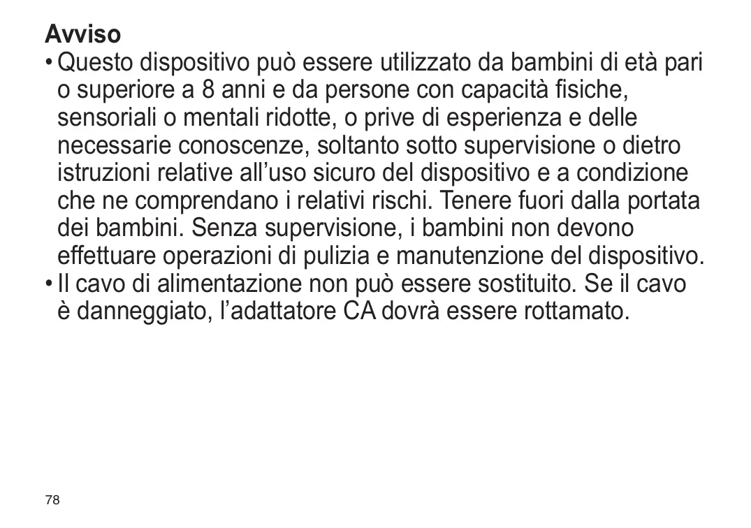 - Questo dispositivo può essere utilizzato da bambini di età pari o superiore a 8 anni e da persone con capacità fisiche, sensoriali o mentali ridotte, o prive di esperienza e delle necessarie conoscenze, soltanto sotto supervisione o dietro istruzioni relative all’uso sicuro del dispositivo e a condizione che ne comprendano i relativi rischi. Tenere fuori dalla portata dei bambini. Senza supervisione, i bambini non devono effettuare operazioni di pulizia e manutenzione del dispositivo.