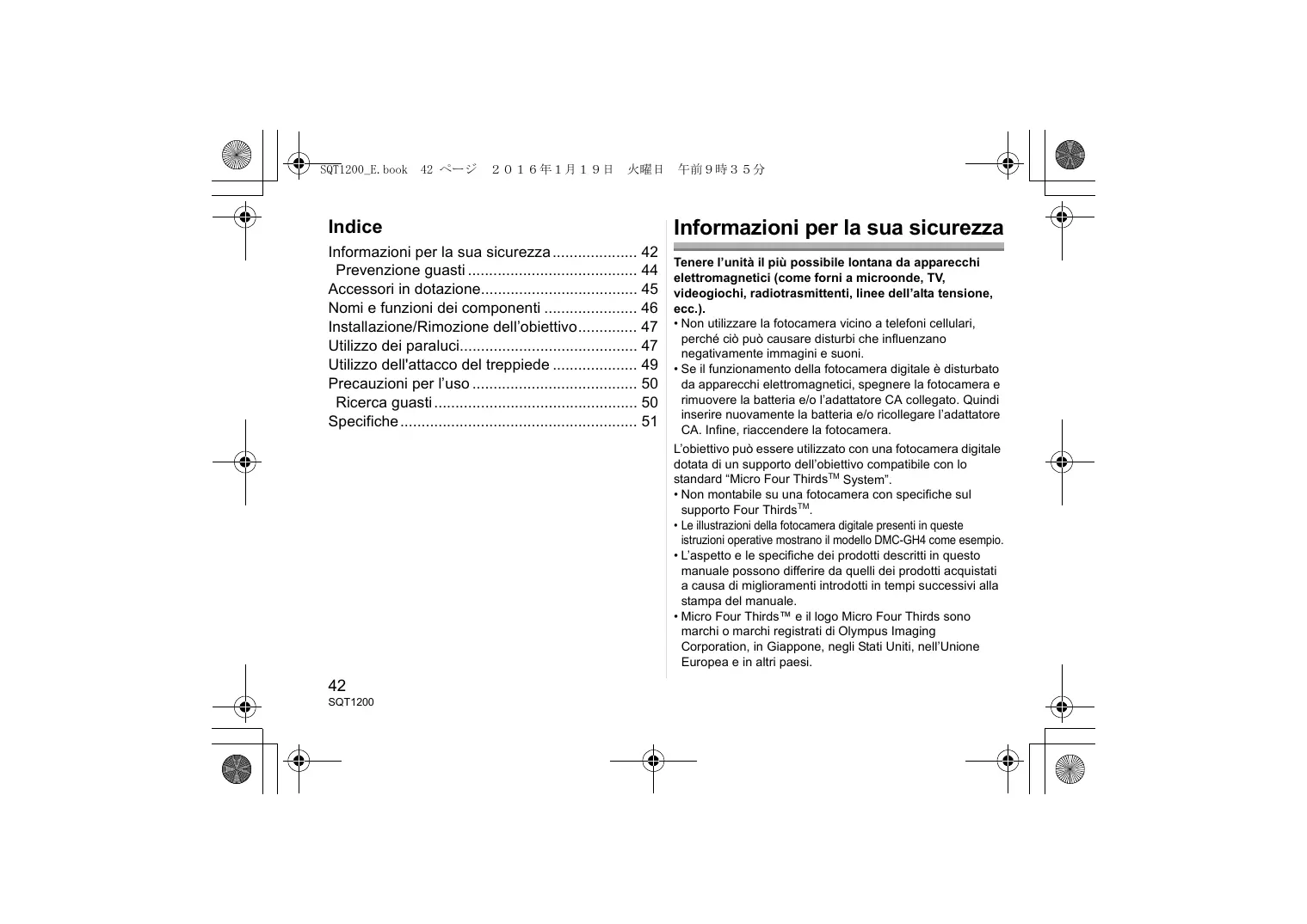 Indice Informazioni per la sua sicurezza 42 Prevenzione guasti 44 Accessori in dotazione 45 Nomi e funzioni dei componenti 46 Installazione/Rimozione dell’obiettivo 47 Utilizzo dei paraluci 47 Utilizzo dell'attacco del treppiede 49 Precauzioni per l’uso 50 Ricerca guasti 50 Specifiche 51
