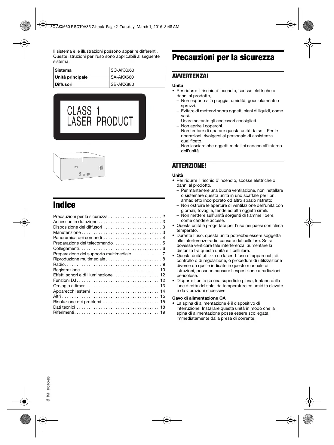 SC-AKX660 E RQT0A86-Z.book Page 2 Tuesday, March 1, 2016 8:48 AM Il sistema e le illustrazioni possono apparire differenti. Queste istruzioni per l’uso sono applicabili al seguente sistema. Precauzioni per la sicurezza Sistema SC-AKX660 Unità principale SA-AKX660 AVVERTENZA! Diffusori SB-AKX880 Unità