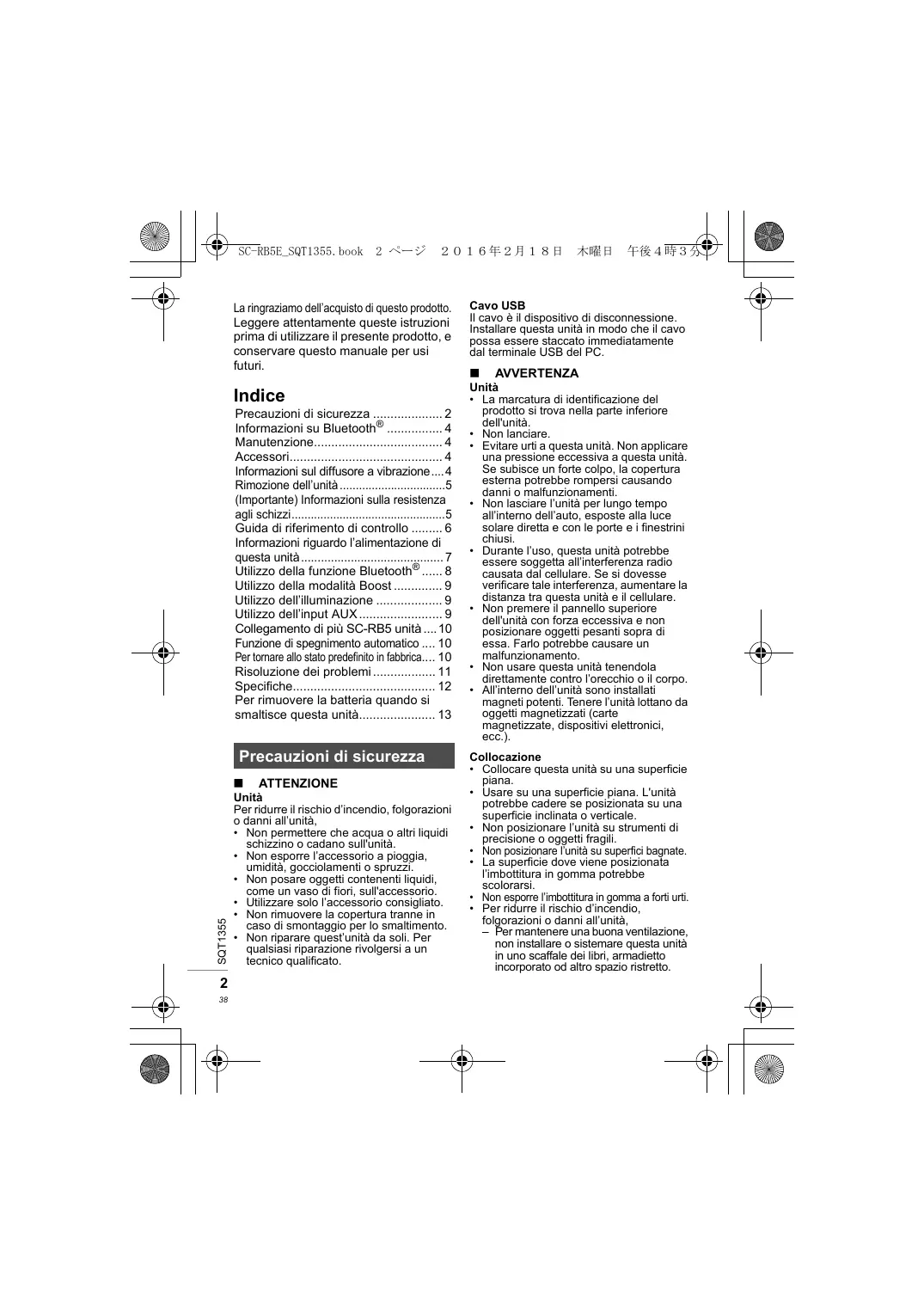 - Il marchio denominativo Bluetooth® e i loghi sono marchi registrati di proprietà di Bluetooth SIG, Inc. e qualsiasi utilizzo di tali marchi da parte di Panasonic Corporation è concesso in licenza. Altri marchi registrati e nomi di marchi sono di proprietà dei rispettivi proprietari. SC-RB5E_SQT1355.book 13 ページ