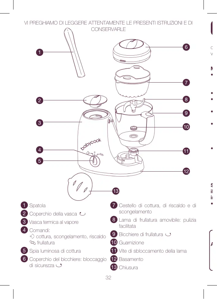 e di izia Vi ringraziamo e ci congratuliamo con voi per la vostra scelta : avete acquistato un apparecchio dalle prestazioni uniche. Il BABYCOOK è stato appositamente progettato per preparare in maniera sana, semplice e rapida i pasti del vostro bebè. BABYCOOK cuoce, scalda e scongela gli alimenti mediante il vapore, preservando così le loro vitamine e permettendone una perfetta frullatura.