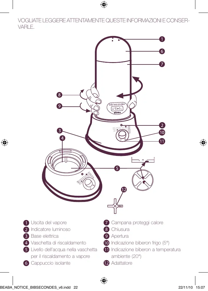 apparecchio non è stato previsto per essere utilizzato da persone (compresi i bambini) con capacità fisiche, sensoriali o mentali ridotte, o da persone prive di esperienza o di conoscenza, salvo che esse abbiano potuto usufruire, tramite una persona responsabile della loro sicurezza, di sorveglianza o di istruzioni preventive riguardanti l’utilizzo dell’apparecchio. • E’ opportuno sorvegliare i bambini per assicurarsi che essi non giochino con l’apparecchio. • Il vostro apparecchio è destinato esclusivamente per uso domestico. • Non immergere la base elettrica nell’acqua. • Per misura di sicurezza, se il cavo di alimentazione è danneggiato, farlo sostituire dal servizio assistenza BÉABA o dal suo rappresentante nazionale autorizzato onde evitare qualsiasi pericolo. IMPORTANTE: Da leggere tassativamente prima di qualsiasi utilizzo. I diversi tempi di riscaldo dell’apparecchio sono stati programmati con un biberon di plastica standard Béaba. L’utilizzo di alcuni biberon può presentare differenze notevoli di temperature. E’ quindi necessario adeguare il tempo di riscaldo dell’apparecchio al tipo di biberon utilizzato (es.: riduzione del tempo di riscaldo per alcuni biberon a collo largo o di vetro). D’altronde: • Il tempo di riscaldo di un biberon standard Béaba è programmato per una temperatura di partenza di 20°C, qualsiasi variazione della temperatura di partenza dell’acqua avrà delle conseguenze sulla temperatura finale. • In caso di un secondo ciclo entro un’ora, è necessario ridurre il tempo di riscaldo. • Per una temperatura ottimale, il biberon deve essere tolto quando la spia luminosa si è spenta. E’ molto importante verificare sempre la temperatura del contenuto del biberon prima di darlo al bambino. Il logo apposto su questo prodotto e raffigurante una pattumiera su ruote barrata indica che il prodotto non può essere smaltito insieme ai rifiuti domestici normali. Per evitare eventuali danni all’ambiente o alle persone, vi preghiamo di separare questo prodotto dagli altri rifiuti, al fine di garantirne il riciclo in modo sicuro per l’ambiente. Per maggiori dettagli sui punti di raccolta esistenti, vi preghiamo di contattare l’amministrazione locale o il dettagliante presso il quale avete acquistato il prodotto.