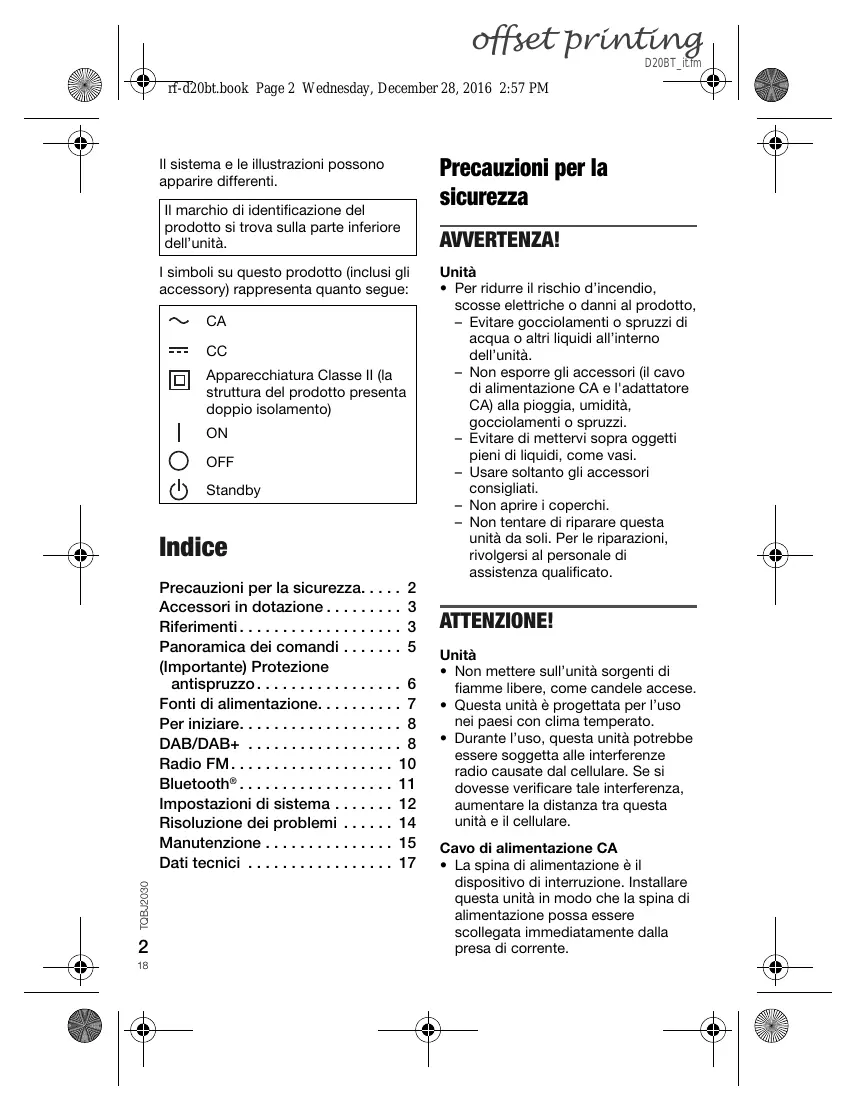 offset printing D20BT_it.fm rf-d20bt.book Page 2 Wednesday, December 28, 2016 2:57 PM Il sistema e le illustrazioni possono apparire differenti. Il marchio di identificazione del prodotto si trova sulla parte inferiore dell’unità. I simboli su questo prodotto (inclusi gli accessory) rappresenta quanto segue: