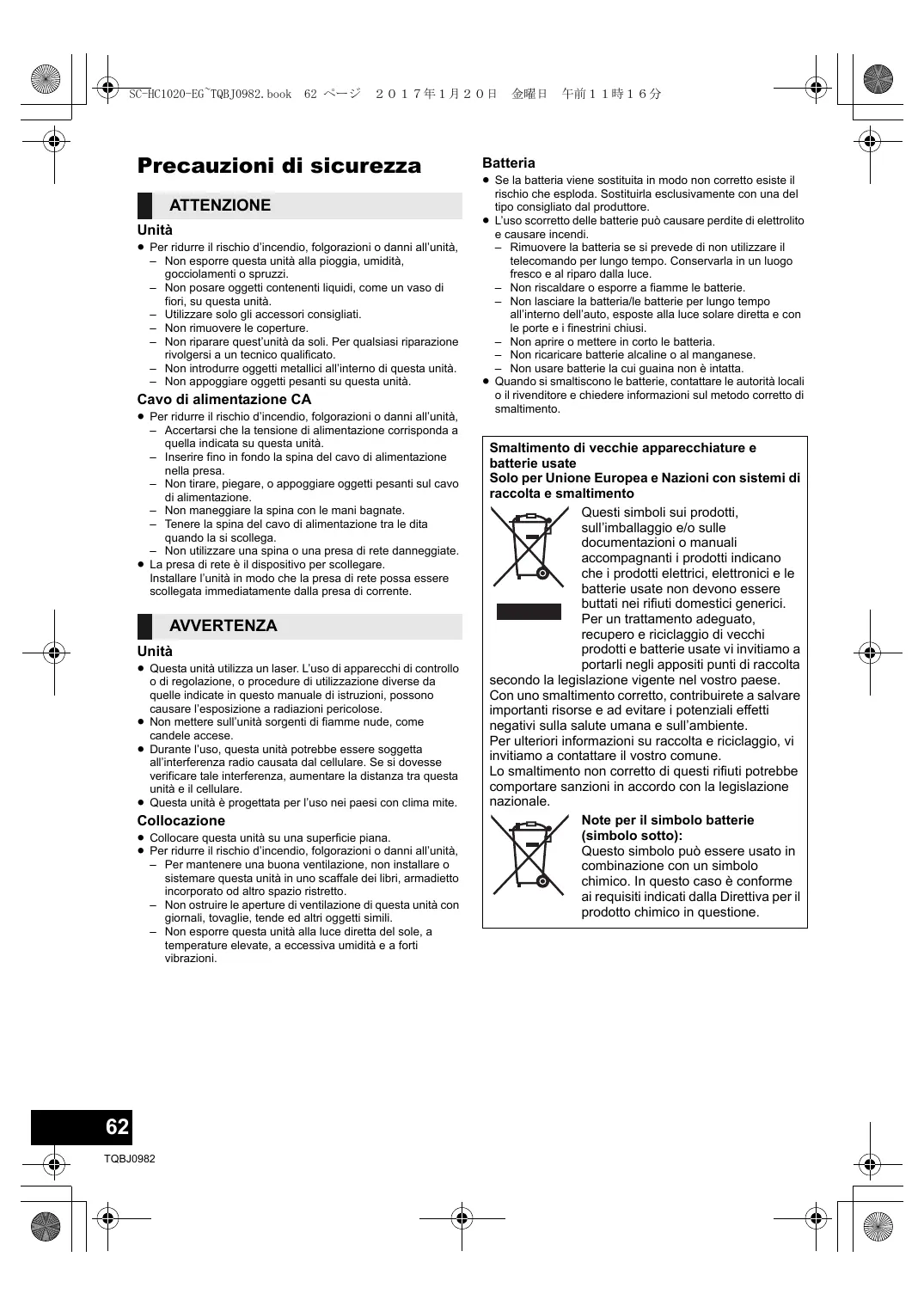 Batteria ≥ Se la batteria viene sostituita in modo non corretto esiste il rischio che esploda. Sostituirla esclusivamente con una del tipo consigliato dal produttore. ≥ L’uso scorretto delle batterie può causare perdite di elettrolito e causare incendi. – Rimuovere la batteria se si prevede di non utilizzare il telecomando per lungo tempo. Conservarla in un luogo fresco e al riparo dalla luce. – Non riscaldare o esporre a fiamme le batterie. – Non lasciare la batteria/le batterie per lungo tempo all’interno dell’auto, esposte alla luce solare diretta e con le porte e i finestrini chiusi. – Non aprire o mettere in corto le batteria. – Non ricaricare batterie alcaline o al manganese. – Non usare batterie la cui guaina non è intatta. ≥ Quando si smaltiscono le batterie, contattare le autorità locali o il rivenditore e chiedere informazioni sul metodo corretto di smaltimento. Smaltimento di vecchie apparecchiature e batterie usate Solo per Unione Europea e Nazioni con sistemi di raccolta e smaltimento Questi simboli sui prodotti, sull’imballaggio e/o sulle documentazioni o manuali accompagnanti i prodotti indicano che i prodotti elettrici, elettronici e le batterie usate non devono essere buttati nei rifiuti domestici generici. Per un trattamento adeguato, recupero e riciclaggio di vecchi prodotti e batterie usate vi invitiamo a portarli negli appositi punti di raccolta secondo la legislazione vigente nel vostro paese. Con uno smaltimento corretto, contribuirete a salvare importanti risorse e ad evitare i potenziali effetti negativi sulla salute umana e sull’ambiente. Per ulteriori informazioni su raccolta e riciclaggio, vi invitiamo a contattare il vostro comune. Lo smaltimento non corretto di questi rifiuti potrebbe comportare sanzioni in accordo con la legislazione nazionale. Note per il simbolo batterie (simbolo sotto): Questo simbolo può essere usato in combinazione con un simbolo chimico. In questo caso è conforme ai requisiti indicati dalla Direttiva per il prodotto chimico in questione. SC-HC1020-EG~TQBJ0982.book 63 ページ