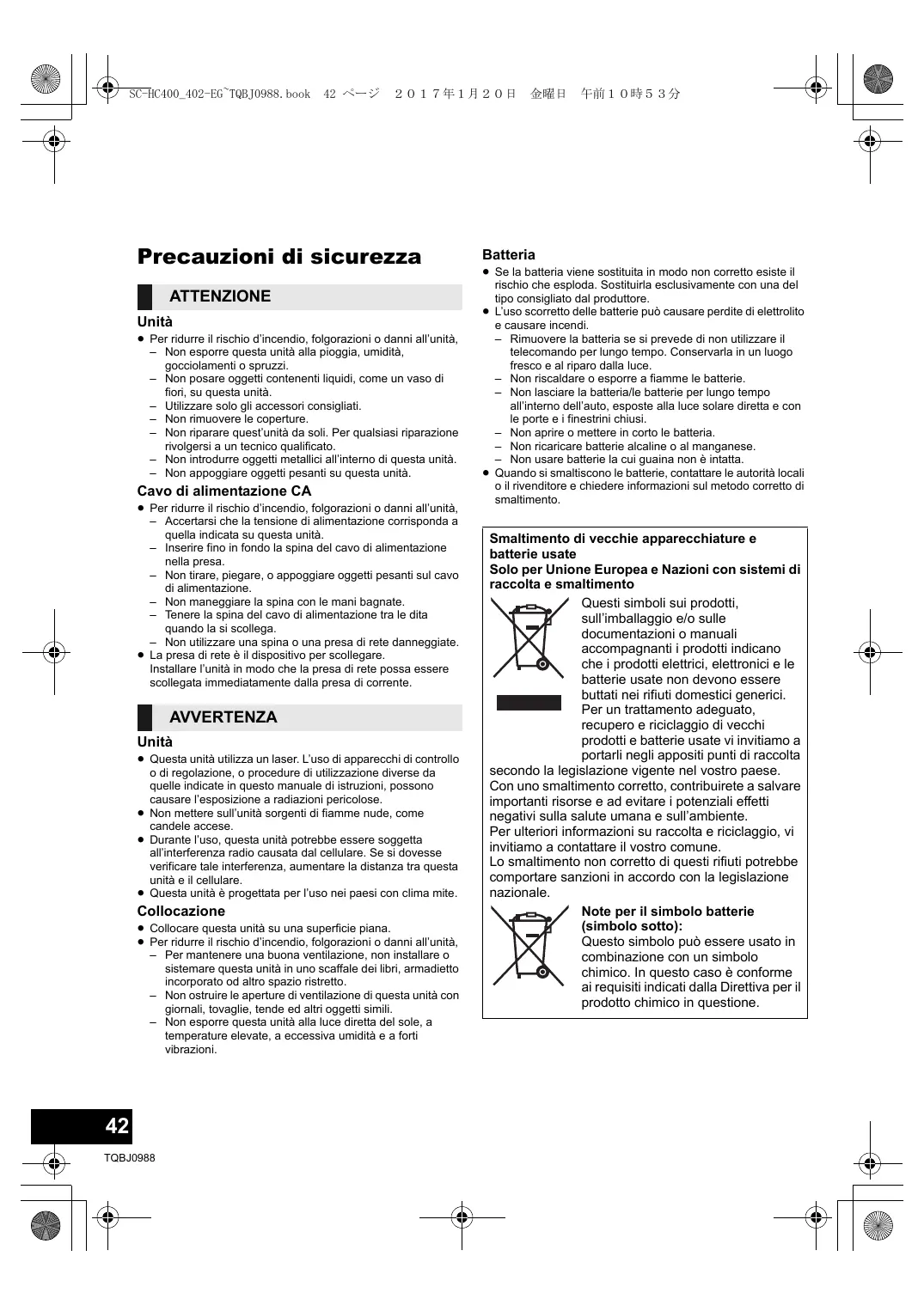 Batteria ≥ Se la batteria viene sostituita in modo non corretto esiste il rischio che esploda. Sostituirla esclusivamente con una del tipo consigliato dal produttore. ≥ L’uso scorretto delle batterie può causare perdite di elettrolito e causare incendi. – Rimuovere la batteria se si prevede di non utilizzare il telecomando per lungo tempo. Conservarla in un luogo fresco e al riparo dalla luce. – Non riscaldare o esporre a fiamme le batterie. – Non lasciare la batteria/le batterie per lungo tempo all’interno dell’auto, esposte alla luce solare diretta e con le porte e i finestrini chiusi. – Non aprire o mettere in corto le batteria. – Non ricaricare batterie alcaline o al manganese. – Non usare batterie la cui guaina non è intatta. ≥ Quando si smaltiscono le batterie, contattare le autorità locali o il rivenditore e chiedere informazioni sul metodo corretto di smaltimento. Smaltimento di vecchie apparecchiature e batterie usate Solo per Unione Europea e Nazioni con sistemi di raccolta e smaltimento Questi simboli sui prodotti, sull’imballaggio e/o sulle documentazioni o manuali accompagnanti i prodotti indicano che i prodotti elettrici, elettronici e le batterie usate non devono essere buttati nei rifiuti domestici generici. Per un trattamento adeguato, recupero e riciclaggio di vecchi prodotti e batterie usate vi invitiamo a portarli negli appositi punti di raccolta secondo la legislazione vigente nel vostro paese. Con uno smaltimento corretto, contribuirete a salvare importanti risorse e ad evitare i potenziali effetti negativi sulla salute umana e sull’ambiente. Per ulteriori informazioni su raccolta e riciclaggio, vi invitiamo a contattare il vostro comune. Lo smaltimento non corretto di questi rifiuti potrebbe comportare sanzioni in accordo con la legislazione nazionale. Note per il simbolo batterie (simbolo sotto): Questo simbolo può essere usato in combinazione con un simbolo chimico. In questo caso è conforme ai requisiti indicati dalla Direttiva per il prodotto chimico in questione. SC-HC400_402-EG~TQBJ0988.book 43 ページ