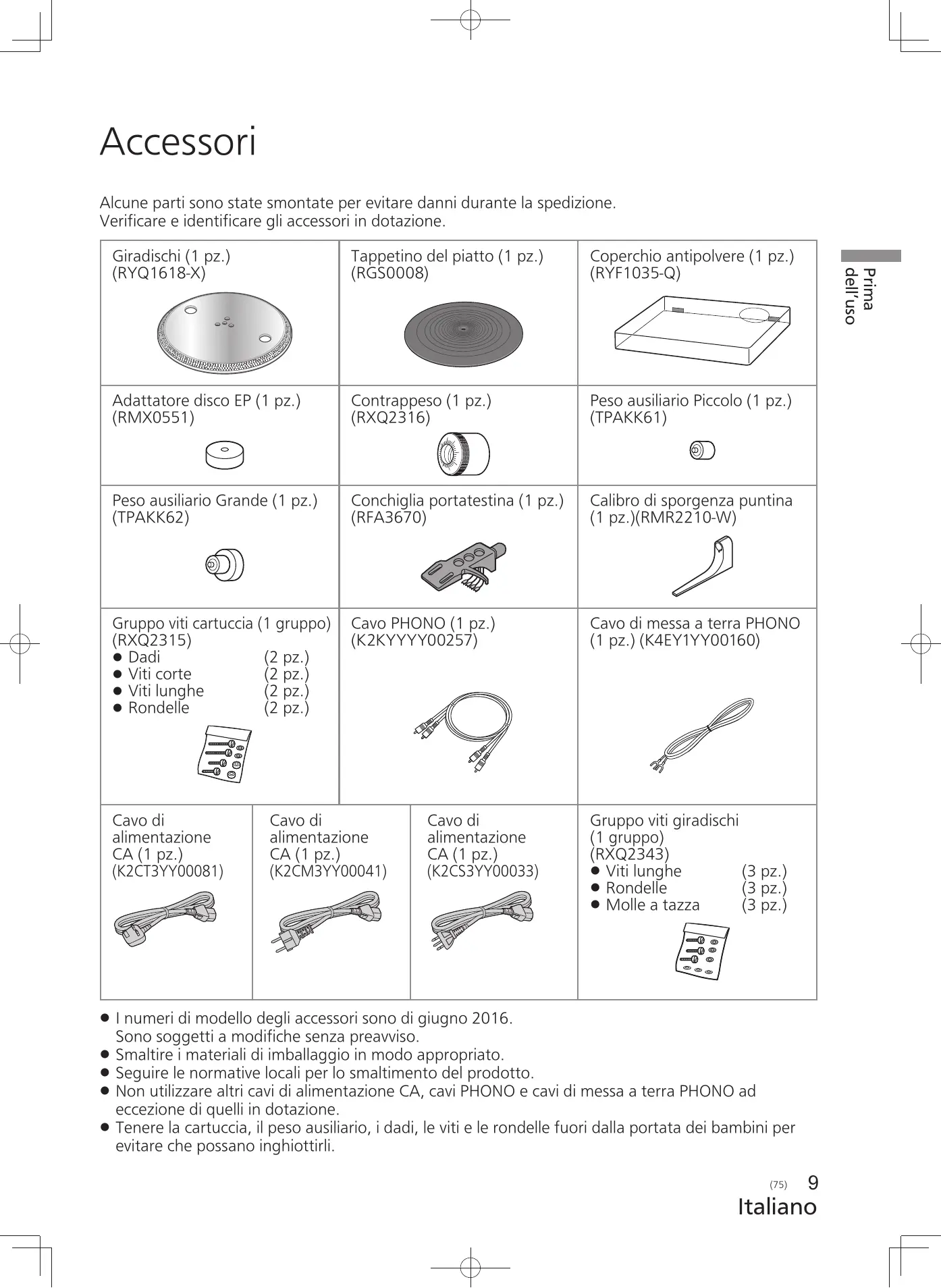 8 (74) Italiano Accessori Alcune parti sono state smontate per evitare danni durante la spedizione. Verificare e identificare gli accessori in dotazione. Tappetino del piatto (1 pz.) (RGS0008) Coperchio antipolvere (1 pz.) (RYF1035-Q) Adattatore disco EP (1 pz.) (RMX0551) Contrappeso (1 pz.) (RXQ2316) Peso ausiliario Piccolo (1 pz.) (TPAKK61) Peso ausiliario Grande (1 pz.) (TPAKK62) Conchiglia portatestina (1 pz.) (RFA3670) Calibro di sporgenza puntina (1 pz.)(RMR2210-W) Gruppo viti cartuccia (1 gruppo) (RXQ2315) (2 pz.) Dadi (2 pz.) Viti corte (2 pz.) Viti lunghe (2 pz.) Rondelle Cavo PHONO (1 pz.) (K2KYYYY00257) Cavo di messa a terra PHONO (1 pz.) (K4EY1YY00160) Cavo di alimentazione CA (1 pz.) (K2CT3YY00081) Cavo di alimentazione CA (1 pz.) (K2CM3YY00041) Cavo di alimentazione CA (1 pz.) (K2CS3YY00033) Gruppo viti giradischi (1 gruppo) (RXQ2343) (3 pz.) Viti lunghe (3 pz.) Rondelle (3 pz.) Molle a tazza I numeri di modello degli accessori sono di giugno 2016. Sono soggetti a modifiche senza preavviso. Smaltire i materiali di imballaggio in modo appropriato. Seguire le normative locali per lo smaltimento del prodotto. Non utilizzare altri cavi di alimentazione CA, cavi PHONO e cavi di messa a terra PHONO ad eccezione di quelli in dotazione. Tenere la cartuccia, il peso ausiliario, i dadi, le viti e le rondelle fuori dalla portata dei bambini per evitare che possano inghiottirli.