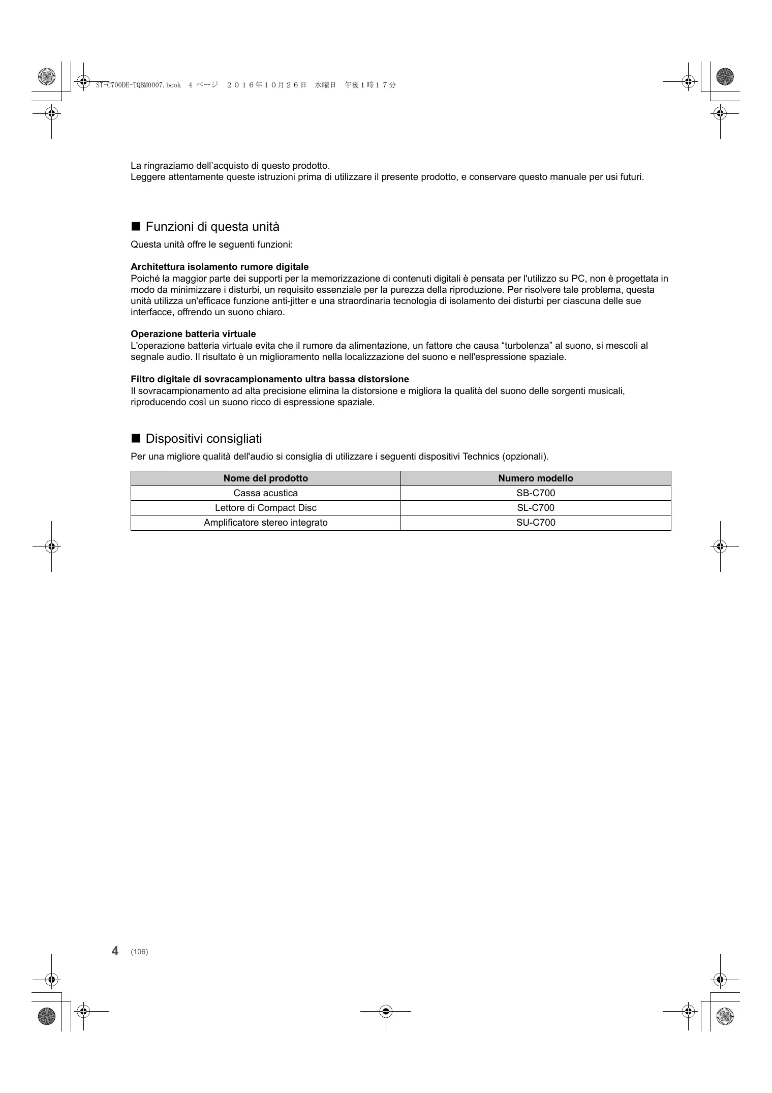 La ringraziamo dell’acquisto di questo prodotto. Leggere attentamente queste istruzioni prima di utilizzare il presente prodotto, e conservare questo manuale per usi futuri. ∫ Funzioni di questa unità Questa unità offre le seguenti funzioni: Architettura isolamento rumore digitale Poiché la maggior parte dei supporti per la memorizzazione di contenuti digitali è pensata per l'utilizzo su PC, non è progettata in modo da minimizzare i disturbi, un requisito essenziale per la purezza della riproduzione. Per risolvere tale problema, questa unità utilizza un'efficace funzione anti-jitter e una straordinaria tecnologia di isolamento dei disturbi per ciascuna delle sue interfacce, offrendo un suono chiaro. Operazione batteria virtuale L'operazione batteria virtuale evita che il rumore da alimentazione, un fattore che causa “turbolenza” al suono, si mescoli al segnale audio. Il risultato è un miglioramento nella localizzazione del suono e nell'espressione spaziale. Filtro digitale di sovracampionamento ultra bassa distorsione Il sovracampionamento ad alta precisione elimina la distorsione e migliora la qualità del suono delle sorgenti musicali, riproducendo così un suono ricco di espressione spaziale. ∫ Dispositivi consigliati Per una migliore qualità dell'audio si consiglia di utilizzare i seguenti dispositivi Technics (opzionali).