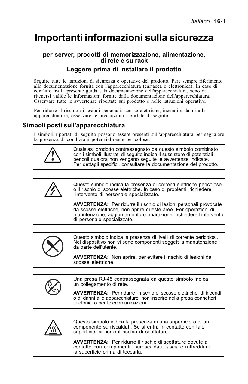 Non sostituire i componenti non hot plug con l'alimentazione attivata. In primo luogo, spegnere il server e scollegare tutti i cavi di alimentazione CA. Attenersi sempre alle procedure relative alla riparazione riportate nella documentazione del prodotto. Tutte le procedure di risoluzione dei problemi e di riparazione contengono i dettagli che consentono soltanto le riparazioni a livello di sottoinsieme e moduli. Data la complessità di schede e sottogruppi singoli, non effettuare riparazioni al livello dei componenti o apportare modifiche alle schede dei circuiti stampati. Riparazioni improprie possono mettere a rischio la sicurezza. Per prodotti collocati sul pavimento, installare ed estendere gli stabilizzatori inferiori prima di installare le opzioni e le schede. Non sovraccaricare il circuito derivato ad alimentazione CA che alimenta il rack. Ciò ridurrà il rischio di danni fisici, incendi o danni all'apparecchiatura. Il carico totale del rack non dovrebbe superare l'80% della potenza del circuito derivato. Rispettare le norme relative al cablaggio dell'edificio e tenere presenti i requisiti di installazione. Precauzioni di sicurezza per i cavi di alimentazione e gli accessori Cavi di alimentazione Per ridurre il rischio di scosse elettriche o di danni alle apparecchiature: ■ Utilizzare un cavo di alimentazione approvato. ■ Se non è stato fornito un cavo di alimentazione per il computer o per qualsiasi opzione ad alimentazione CA del computer, acquistare un cavo di alimentazione approvato per l'uso nel proprio Paese. ■ Il cavo di alimentazione deve essere adatto per il prodotto e per la tensione e la potenza contrassegnate sull'etichetta della potenza nominale del prodotto. La tensione e la potenza nominale del cavo devono essere superiori alla tensione e alla potenza nominale contrassegnate sul prodotto. ■ In caso di dubbi sul tipo di cavo di alimentazione da utilizzare, contattare il Centro di Assistenza Autorizzata HP. ■ Non collocare oggetti sui cavi di alimentazione CA o sui cavi. Disporli in un punto in cui non possano essere calpestati, non vi si possa inciampare e non vengano rimossi accidentalmente. ■ Non tirare i cavi. Quando si scollegano i cavi, estrarli dalla presa di corrente afferrandoli per il connettore. ■ Assicurarsi che la potenza totale in ampere di tutti i prodotti collegati nella prolunga o nella basetta di alimentazione non superi l'80% del limite di potenza in ampere della prolunga o della basetta di alimentazione. ■ Non disattivare la spina collegata a massa del cavo di alimentazione. Si tratta, infatti, di un'importante misura di sicurezza. ■ Inserire il cavo di alimentazione in una presa di corrente collegata a massa facilmente accessibile all'operatore in qualsiasi momento. Alimentatori ■ Gli alimentatori hot plug non sono stati progettati per essere rimossi o installati con l'alimentazione CA collegata all'alimentatore. Per ridurre il rischio di scosse elettriche o di danni all'apparecchiatura nel maneggiare alimentatori hot plug: q Installare l'alimentatore prima di collegare il cavo di alimentazione all'alimentatore. q Scollegare il cavo di alimentazione prima di rimuovere l'alimentazione dal server. q Se il sistema ha più fonti di alimentazione, scollegare tutti i cavi di alimentazione CA dagli alimentatori per scollegare completamente il sistema dall'alimentazione. ■ Verificare che l'alimentazione esterna collegata al server corrisponda al tipo di alimentazione indicata sull'etichetta delle specifiche elettriche. Se non si è sicuri del tipo di alimentazione richiesta, contattare il Centro di Assistenza Autorizzata HP o la società elettrica locale. 16-4 Italiano Gruppi di continuità (UPS, Uninterruptible Power Supply) ■ Per ridurre il rischio di scosse elettriche e/o di danni all'apparecchiatura durante l'installazione o la gestione dei prodotti UPS: q L'installazione delle opzioni, la gestione e la manutenzione dei prodotti UPS devono essere eseguite da tecnici qualificati e preparati ad affrontare le procedure, le precauzioni e i rischi connessi ai prodotti ad alimentazione CA. q I prodotti Hardwired UPS richiedono un collegamento diretto a un circuito derivato ad alimentazione CA (CA principale). Il collegamento deve essere effettuato da un elettricista autorizzato, in conformità con l'articolo 310 del National Electrical Code (NFPA70) per il Nord America o in base alle norme equivalenti sul cablaggio locali o nazionali. q Prima di procedere con la manutenzione o prima di sostituire un componente non hot plug, utilizzare una procedura Lockout/Tagout per isolare i prodotti hardwired UPS dall'alimentazione CA. q Non utilizzare un UPS scollegato dall'alimentazione CA. Utilizzare il pulsante TEST/ALARM RESET per testare le batterie. Prima di scollegare l'UPS dall'alimentazione CA, scollegare tutti i carichi protetti. q Prima di mettere in funzione il server o di sostituire un componente non hot plug, è necessario scollegare fisicamente i prodotti UPS dall'alimentazione CA. q Non sovraccaricare l'uscita dell'UPS. Il carico totale collegato non deve superare l'80% dell'uscita nominale. q Non superare il limite corrente di dispersione per il tipo di UPS presente nel sistema. Per ulteriori informazioni sui limiti, consultare la sezione Dispersione di corrente tramite messa a terra più avanti nel presente documento. q Per le installazioni su rack, non superare il numero massimo di prodotti UPS in ogni singolo rack. q Per installazioni su rack, installare l'UPS solo nella parte inferiore del rack. ■ Per ridurre il rischio di lesioni personali o di danni all'apparecchiatura durante l'installazione di una porta REPO (Remote Emergency Power Off): q La porta REPO deve essere collegata da un elettricista qualificato. q Prima di collegare la porta REPO, verificare che il principale dispositivo di disconnessione dell'alimentazione CA dell'UPS sia bloccato e/o inserito in coda in posizione OFF. q In Nord America, il circuito REPO 