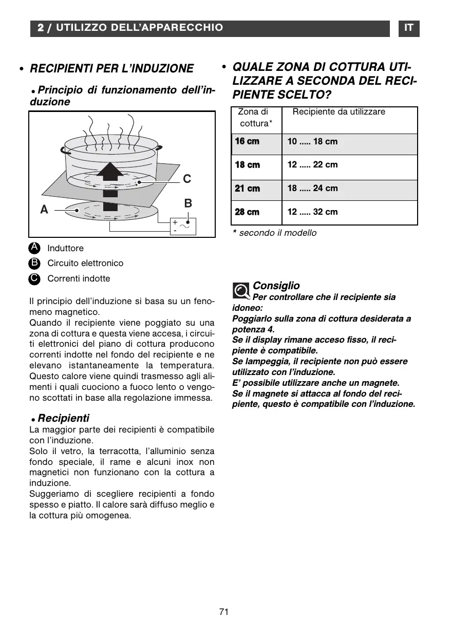 - secondo il modello A Induttore B Circuito elettronico C Correnti indotte Consiglio Per controllare che il recipiente sia idoneo: Poggiarlo sulla zona di cottura desiderata a potenza 4. Se il display rimane acceso fisso, il recipiente è compatibile. Se lampeggia, il recipiente non può essere utilizzato con l’induzione. E’ possibile utilizzare anche un magnete. Se il magnete si attacca al fondo del recipiente, questo è compatibile con l’induzione. Il principio dell’induzione si basa su un fenomeno magnetico. Quando il recipiente viene poggiato su una zona di cottura e questa viene accesa, i circuiti elettronici del piano di cottura producono correnti indotte nel fondo del recipiente e ne elevano istantaneamente la temperatura. Questo calore viene quindi trasmesso agli alimenti i quali cuociono a fuoco lento o vengono scottati in base alla regolazione immessa.