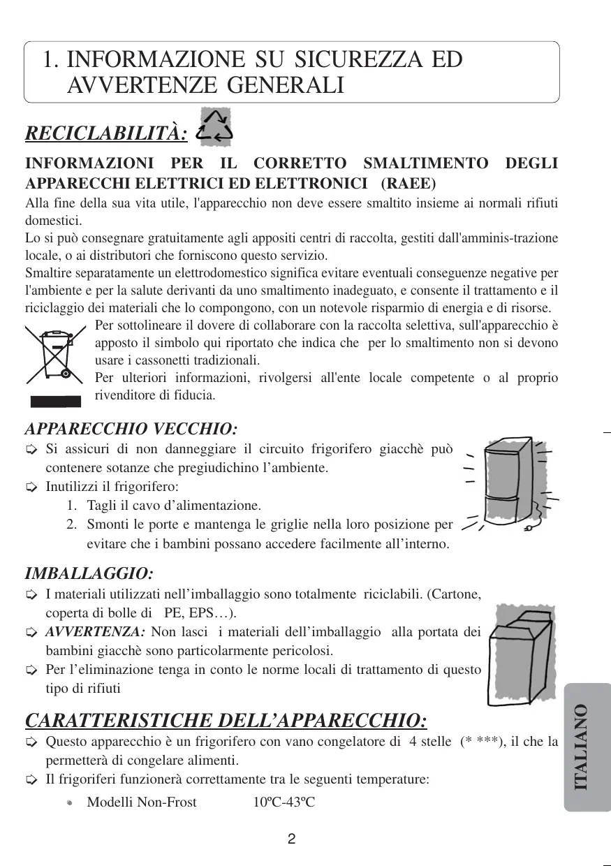 APPARECCHI ELETTRICI ED ELETTRONICI (RAEE) DEGLI Alla fine della sua vita utile, l'apparecchio non deve essere smaltito insieme ai normali rifiuti domestici. Lo si può consegnare gratuitamente agli appositi centri di raccolta, gestiti dall'amminis-trazione locale, o ai distributori che forniscono questo servizio. Smaltire separatamente un elettrodomestico significa evitare eventuali conseguenze negative per l'ambiente e per la salute derivanti da uno smaltimento inadeguato, e consente il trattamento e il riciclaggio dei materiali che lo compongono, con un notevole risparmio di energia e di risorse. Per sottolineare il dovere di collaborare con la raccolta selettiva, sull'apparecchio è apposto il simbolo qui riportato che indica che per lo smaltimento non si devono usare i cassonetti tradizionali. Per ulteriori informazioni, rivolgersi all'ente locale competente o al proprio rivenditore di fiducia. APPARECCHIO VECCHIO: Si assicuri di non danneggiare il circuito frigorifero giacchè può contenere sotanze che pregiudichino l’ambiente. Inutilizzi il frigorifero: