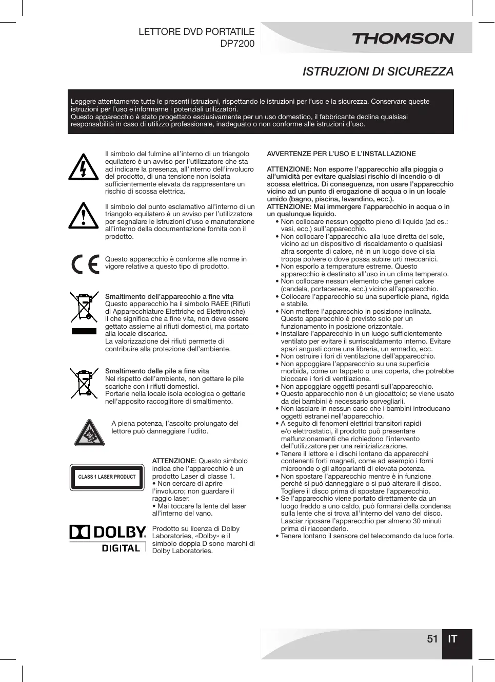 Leggere attentamente tutte le presenti istruzioni, rispettando le istruzioni per l’uso e la sicurezza. Conservare queste istruzioni per l’uso e informarne i potenziali utilizzatori. Questo apparecchio è stato progettato esclusivamente per un uso domestico, il fabbricante declina qualsiasi responsabilità in caso di utilizzo professionale, inadeguato o non conforme alle istruzioni d’uso. Il simbolo del fulmine all’interno di un triangolo equilatero è un avviso per l’utilizzatore che sta ad indicare la presenza, all’interno dell’involucro del prodotto, di una tensione non isolata sufficientemente elevata da rappresentare un rischio di scossa elettrica. Il simbolo del punto esclamativo all’interno di un triangolo equilatero è un avviso per l’utilizzatore per segnalare le istruzioni d’uso e manutenzione all’interno della documentazione fornita con il prodotto. Questo apparecchio è conforme alle norme in vigore relative a questo tipo di prodotto. Smaltimento dell’apparecchio a fine vita Questo apparecchio ha il simbolo RAEE (Rifiuti di Apparecchiature Elettriche ed Elettroniche) il che significa che a fine vita, non deve essere gettato assieme ai rifiuti domestici, ma portato alla locale discarica. La valorizzazione dei rifiuti permette di contribuire alla protezione dell’ambiente. Smaltimento delle pile a fine vita Nel rispetto dell’ambiente, non gettare le pile scariche con i rifiuti domestici. Portarle nella locale isola ecologica o gettarle nell’apposito raccoglitore di smaltimento. A piena potenza, l’ascolto prolungato del lettore può danneggiare l’udito.