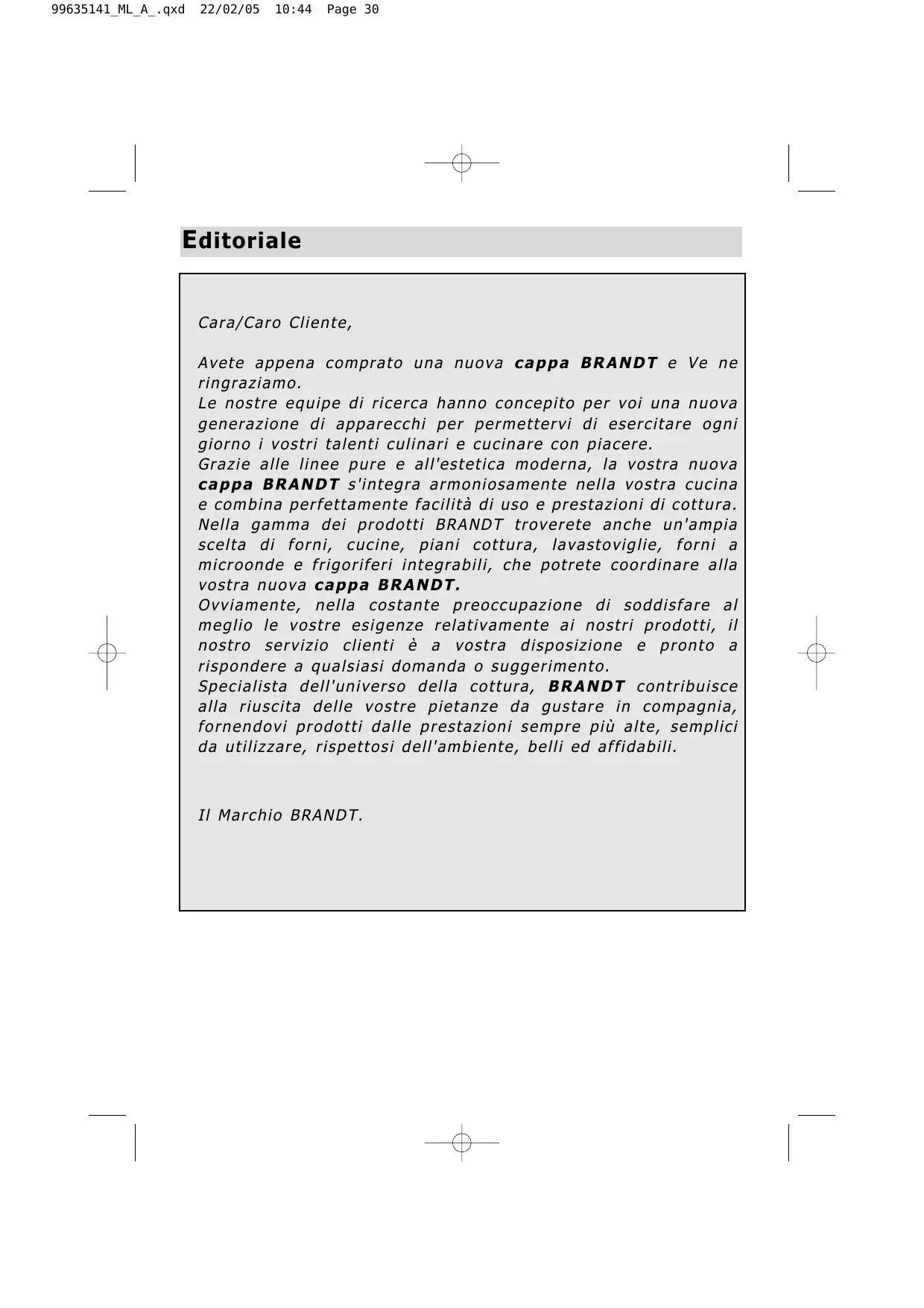 99635141_ML_A_.qxd 22/02/05 10:44 Page 30 E ditoriale Cara/Caro Cliente, Avete appena comprato una nuova cappa BRANDT e Ve ne ringraziamo. Le nostre equipe di ricerca hanno concepito per voi una nuova generazione di apparecchi per permettervi di esercitare ogni giorno i vostri talenti culinari e cucinare con piacere. Grazie alle linee pure e all'estetica moderna, la vostra nuova cappa BRANDT s'integra armoniosamente nella vostra cucina e combina perfettamente facilità di uso e prestazioni di cottura. Nella gamma dei prodotti BRANDT troverete anche un'ampia scelta di forni, cucine, piani cottura, lavastoviglie, forni a microonde e frigoriferi integrabili, che potrete coordinare alla vostra nuova cappa BRANDT. Ovviamente, nella costante preoccupazione di soddisfare al meglio le vostre esigenze relativamente ai nostri prodotti, il nostro servizio clienti è a vostra disposizione e pronto a rispondere a qualsiasi domanda o suggerimento. Specialista dell'universo della cottura, BRANDT contribuisce alla riuscita delle vostre pietanze da gustare in compagnia, fornendovi prodotti dalle prestazioni sempre più alte, semplici da utilizzare, rispettosi dell'ambiente, belli ed affidabili. Il Marchio BRANDT. 99635141_ML_A_.qxd 22/02/05 10:44 Page 31 P rescrizioni di sicurezza - È vietato cuocere pietanze al flambé oppure far funzionare i fornelli a gas senza porre pentole sopra di essi (le fiamme aspirate rischierebbero di deteriorare la cappa). - Le fritture effettuate sotto l'apparecchio devono essere sorvegliate costantemente. - Le riparazioni devono essere effettuate esclusivamente da un tecnico autorizzato. - Pulite regolarmente il filtro cassetta per evitare qualsiasi rischio di incendio. - Il funzionamento al di sopra di un fornello a combustibile (legna, carbone, ecc.) non è consentito. Queste cappe sono state progettate per essere utilizzate all'interno di abitazioni private a scopo non professionale. Nel costante tentativo di migliorare i nostri prodotti, ci riserviamo il diritto di apportare qualsiasi modifica alle loro caratteristiche tecniche, funzionali o estetiche, parallelamente all'evoluzione tecnica. Queste cappe sono destinate esclusivamente alla cottura di bevande e derrate alimentari. Questi prodotti non contengono alcun componente a base di amianto. In tutto il manuale, il simbolo segnala le prescrizioni di sicurezza, segnala i consigli e le astuzie