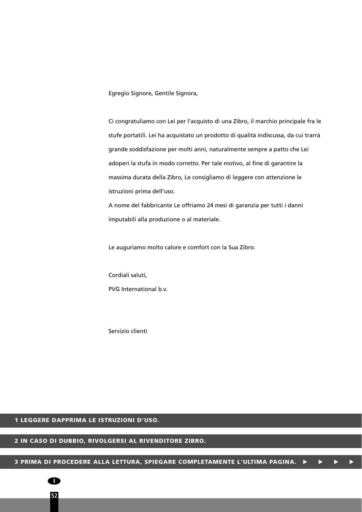 Egregio Signore, Gentile Signora, Ci congratuliamo con Lei per l'acquisto di una Zibro, il marchio principale fra le stufe portatili. Lei ha acquistato un prodotto di qualità indiscussa, da cui trarrà grande soddisfazione per molti anni, naturalmente sempre a patto che Lei adoperi la stufa in modo corretto. Per tale motivo, al fine di garantire la massima durata della Zibro, Le consigliamo di leggere con attenzione le istruzioni prima dell'uso. A nome del fabbricante Le offriamo 24 mesi di garanzia per tutti i danni imputabili alla produzione o al materiale. Le auguriamo molto calore e comfort con la Sua Zibro. Cordiali saluti, PVG International b.v. Servizio clienti 1 LEGGERE DAPPRIMA LE ISTRUZIONI D'USO. 2 IN CASO DI DUBBIO, RIVOLGERSI AL RIVENDITORE ZIBRO. 3 PRIMA DI PROCEDERE ALLA LETTURA, SPIEGARE COMPLETAMENTE L'ULTIMA PAGINA.