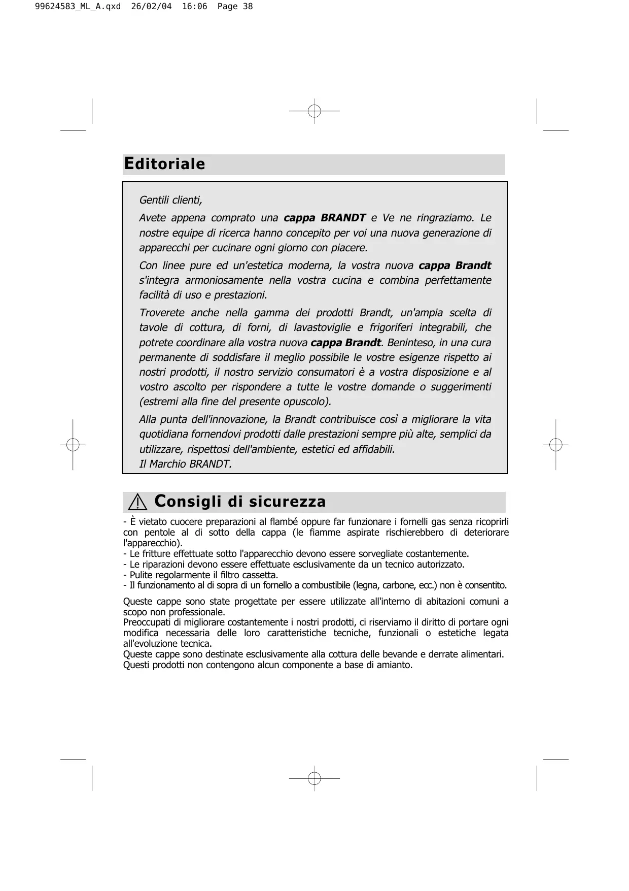 99624583_ML_A.qxd 26/02/04 16:06 Page 38 E ditoriale Gentili clienti, Avete appena comprato una cappa BRANDT e Ve ne ringraziamo. Le nostre equipe di ricerca hanno concepito per voi una nuova generazione di apparecchi per cucinare ogni giorno con piacere. Con linee pure ed un'estetica moderna, la vostra nuova cappa Brandt s'integra armoniosamente nella vostra cucina e combina perfettamente facilità di uso e prestazioni. Troverete anche nella gamma dei prodotti Brandt, un'ampia scelta di tavole di cottura, di forni, di lavastoviglie e frigoriferi integrabili, che potrete coordinare alla vostra nuova cappa Brandt. Beninteso, in una cura permanente di soddisfare il meglio possibile le vostre esigenze rispetto ai nostri prodotti, il nostro servizio consumatori è a vostra disposizione e al vostro ascolto per rispondere a tutte le vostre domande o suggerimenti (estremi alla fine del presente opuscolo). Alla punta dell'innovazione, la Brandt contribuisce così a migliorare la vita quotidiana fornendovi prodotti dalle prestazioni sempre più alte, semplici da utilizzare, rispettosi dell'ambiente, estetici ed affidabili. Il Marchio BRANDT. C onsigli di sicurezza - È vietato cuocere preparazioni al flambé oppure far funzionare i fornelli gas senza ricoprirli con pentole al di sotto della cappa (le fiamme aspirate rischierebbero di deteriorare l'apparecchio). - Le fritture effettuate sotto l'apparecchio devono essere sorvegliate costantemente. - Le riparazioni devono essere effettuate esclusivamente da un tecnico autorizzato. - Pulite regolarmente il filtro cassetta. - Il funzionamento al di sopra di un fornello a combustibile (legna, carbone, ecc.) non è consentito. Queste cappe sono state progettate per essere utilizzate all'interno di abitazioni comuni a scopo non professionale. Preoccupati di migliorare costantemente i nostri prodotti, ci riserviamo il diritto di portare ogni modifica necessaria delle loro caratteristiche tecniche, funzionali o estetiche legata all'evoluzione tecnica. Queste cappe sono destinate esclusivamente alla cottura delle bevande e derrate alimentari. Questi prodotti non contengono alcun componente a base di amianto. 99624583_ML_A.qxd 26/02/04 16:06 Page 39 Nell'intero manuale, vi segnala le consegne di sicurezza, Vi segnala i consigli ed astuzie C ome si presenta la cappa ? Fig.1 Modello a 3 velocità