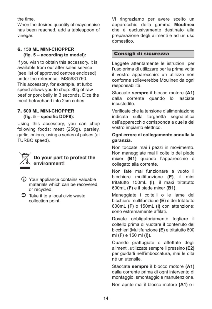 Non fate mai funzionare a vuoto il bicchiere multifunzione (E), il mini tritatutto 150mL (I), il maxi tritatutto 600mL (F) e il piede mixer (B1). Your appliance contains valuable materials which can be recovered or recycled. Take it to a local civic waste collection point. Maneggiate i coltelli o le lame del bicchiere multifunzione (E) e dei tritatutto 600mL (F) o 150mL (I) con attenzione: sono estremamente affilati. Dovete obbligatoriamente togliere il coltello prima di vuotare il contenuto dei bicchieri (Multifunzione (E) e tritatutto 600 ml (F) e 150 ml (I)). Quando grattugiate o affettate degli alimenti, utilizzate sempre il pressino (E2) per guidarli nell’imboccatura, mai le dita né un utensile. Staccate sempre il blocco motore (A1) dalla corrente prima di ogni intervento di montaggio, smontaggio e manutenzione. Non aprite mai il blocco motore (A1) o i