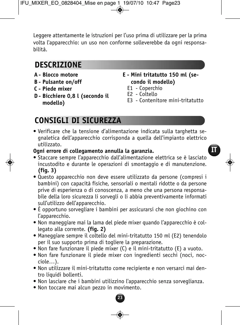 IFU_MIXER_EO_0828404_Mise en page 1 19/07/10 10:47 Page23 Leggere attentamente le istruzioni per l’uso prima di utilizzare per la prima volta l'apparecchio: un uso non conforme solleverebbe da ogni responsabilità. DESCRIZIONE A - Blocco motore B - Pulsante on/off C - Piede mixer D - Bicchiere 0,8 l (secondo il modello) E - Mini tritatutto 150 ml (secondo il modello) E1 - Coperchio E2 - Coltello E3 - Contenitore mini-tritatutto