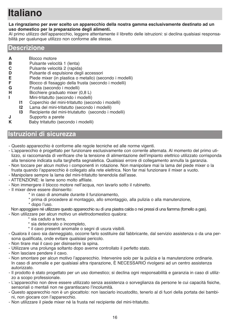 Blocco motore Pulsante velocità 1 (lenta) Pulsante velocità 2 (rapida) Pulsante di espulsione degli accessori Piede mixer (in plastica o metallo) (secondo i modelli) Blocco di fissaggio della frusta (secondo i modelli) Frusta (secondo i modelli) Bicchiere graduato mixer (0,8 L) Mini-tritatutto (secondo i modelli) Coperchio del mini-tritatutto (secondo i modelli) Lama del mini-tritatutto (secondo i modelli) Recipiente del mini-triutatutto (secondo i modelli) Supporto a parete Baby tritatutto (secondo i modelli) Istruzioni di sicurezza - Questo apparecchio è conforme alle regole tecniche ed alle norme vigenti. - L’apparecchio è progettato per funzionare esclusivamente con corrente alternata. Al momento del primo utilizzo, si raccomanda di verificare che la tensione di alimentazione dell’impianto elettrico utilizzato corrisponda alla tensione indicata sulla targhetta segnaletica. Qualsiasi errore di collegamento annulla la garanzia. - Non toccare per alcun motivo i componenti in rotazione. Non manipolare mai la lama del piede mixer o la frusta quando l’apparecchio è collegato alla rete elettrica. Non far mai funzionare il mixer a vuoto. - Manipolare sempre la lama del mini-tritatutto tenendola dall’asse. - ATTENZIONE: le lame sono molto affilate. - Non immergere il blocco motore nell’acqua, non lavarlo sotto il rubinetto. - Il mixer deve essere disinserito: