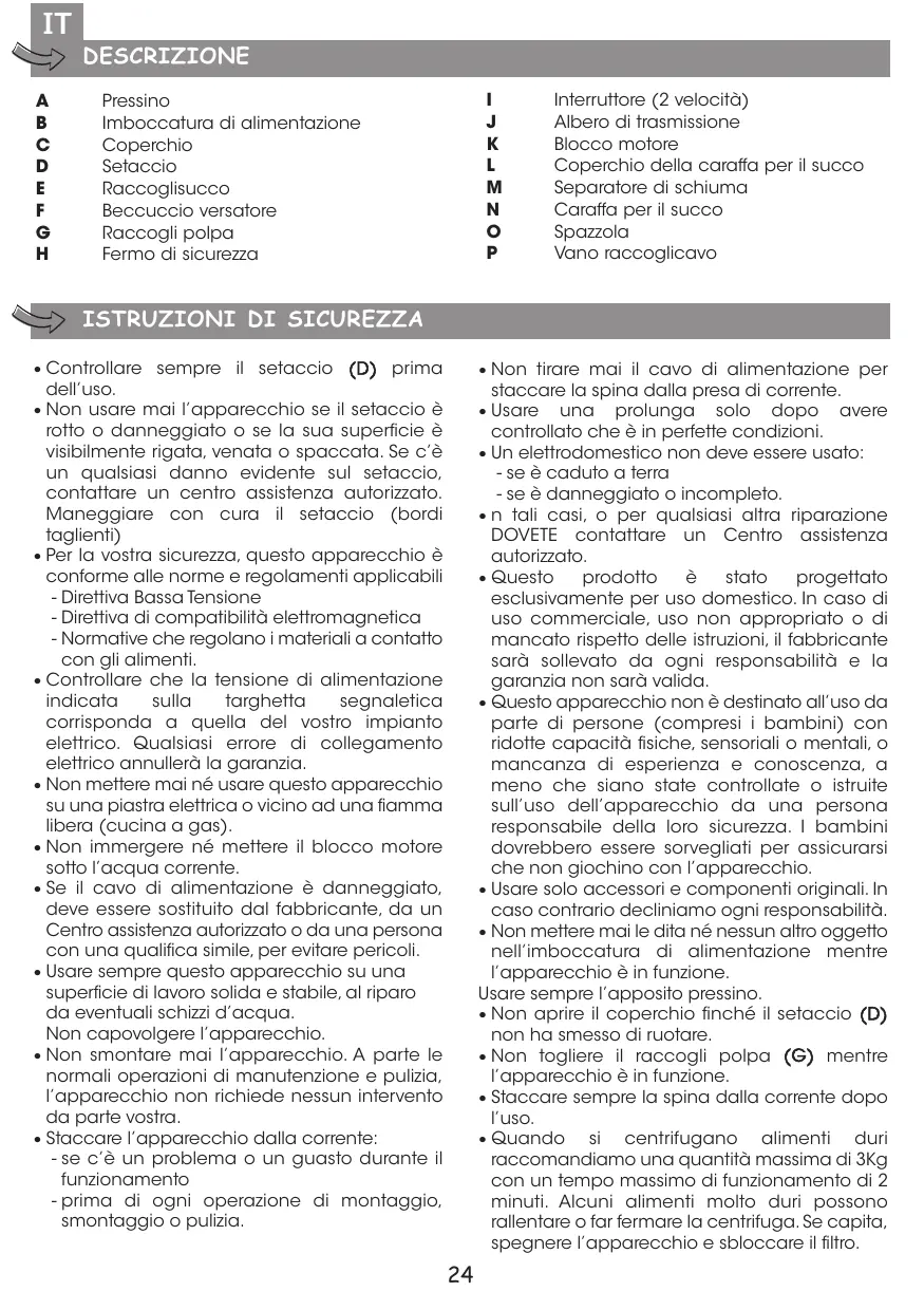 COSA FARE SE L’APPARECCHIO NON FUNZIONA? PROBLEMA L’apparecchio non funziona. CAUSE La spina non è inserita correttamente, l’interruttore (I) non è posizionato sulla velocità “1” o “2”. SOLUZIONI Connettere l’apparecchio su una presa con la tensione giusta. Spostare l’interruttore sulla velocità “1” o “2”. Controllare che il coperchio (C) sia Il coperchio (C) non è posizionato posizionato e fissato correttamente correttamente. dal fermo di sicurezza (H). L’apparecchio emana odore o è molto caldo al tatto, fa un rumore anomalo o emette fumo. La fuoriuscita del succo diminuisce. Il setaccio (D) non è correttamente inserito. Controllate che il setaccio (D) sia stato posizionato correttamente sull’albero di trasmissione (J). Avete inserito una quantità eccessiva di alimenti. Lasciate raffreddare l’apparecchio e riducete la quantità di alimenti. Il setaccio (D) è bloccato. Spegnete l’apparecchio, pulite l’imboccatura di alimentazione (B) e il setaccio (D). Per qualsiasi altro problema o anomalia, contattate il Centro assistenza autorizzato più vicino. RICICLAGGIO Partecipiamo alla protezione dell’ambiente! Questo apparecchio è composto da vari materiali che possono essere recuperati o riciclati. Portatelo al punto di raccolta rifiuti del vostro comune in modo che possa essere riciclato.