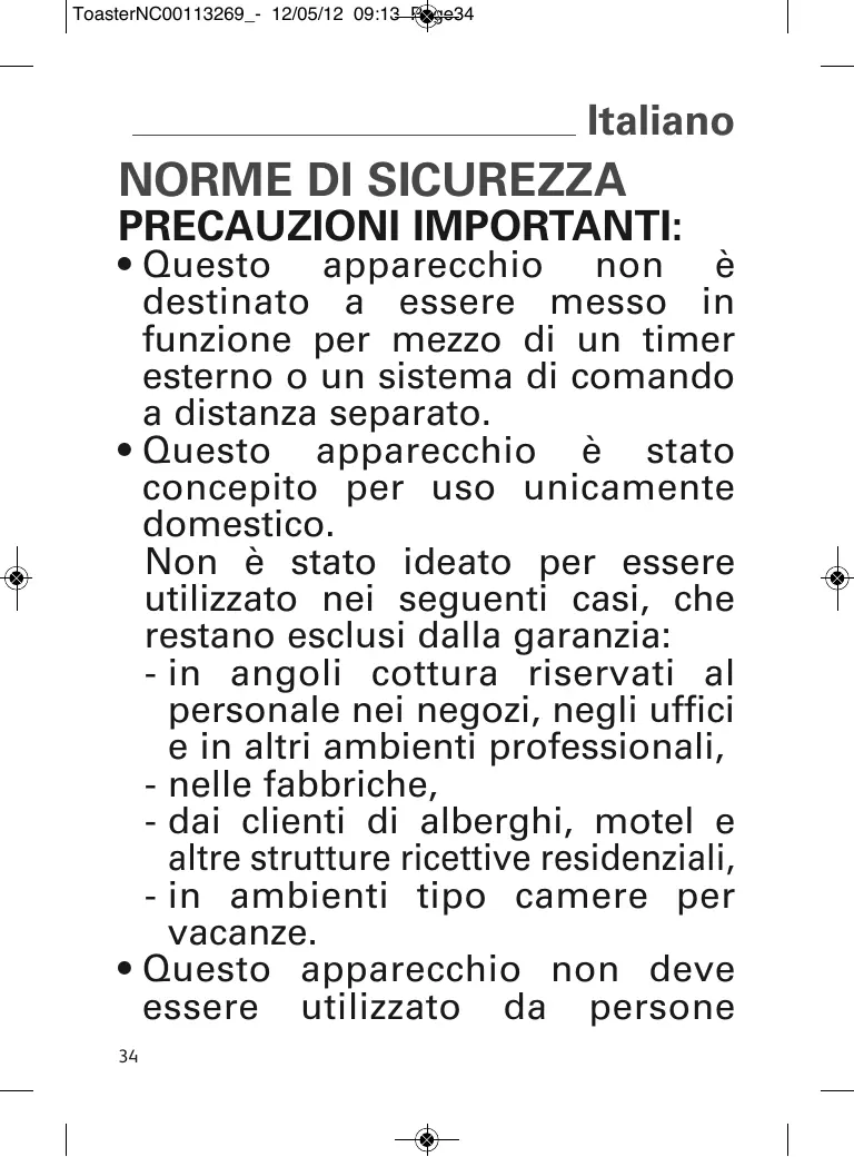 ToasterNC00113269_- 12/05/12 09:13 Page35 (compresi i bambini) le cui capacità fisiche, sensoriali o mentali sono ridotte, o da persone prive di esperienza o di conoscenza, tranne se hanno potuto beneficiare, tramite una persona responsabile della loro sicurezza, di una sorveglianza o di istruzioni preliminari relative all’uso dell’apparecchio.