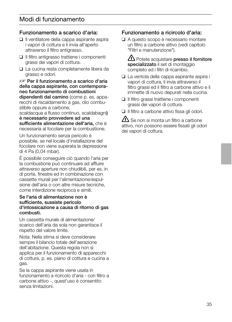 Vul het nummer in de bovenstaande vakjes in. De nummers staan op het typeplaatje dat u vindt in de binnenruimte van de afzuigkap nadat u het filterrooster hebt verwijderd. 몇 De fabrikant van de afzuigkap is niet aansprakelijk voor reclamaties die terug te leiden zijn op de planning en uitvoering van de buisleiding. Modi di funzionamento Funzionamento a scarico d'aria: Funzionamento a ricircolo d'aria: ❑ Il ventilatore della cappa aspirante aspira i vapori di cottura e li invia all'aperto attraverso il filtro antigrasso. ❑ Il filtro antigrasso trattiene i componenti grassi dei vapori di cottura. ❑ La cucina resta completamente libera da grasso e odori. D Per il funzionamento a scarico d'aria della cappa aspirante, con contemporaneo funzionamento di combustioni dipendenti dal camino (come p. es. apparecchi di riscaldamento a gas, olio combustibile oppure a carbone, scaldacqua a flusso continuo, scaldabagni) è necessario provvedere ad una sufficiente alimentazione dell'aria, che è necessaria al focolare per la combustione. Un funzionamento senza pericolo è possibile, se nel locale d'installazione del focolare non viene superata la depressione di 4 Pa (0,04 mbar). È possibile conseguire ciò quando l'aria per la combustione può continuare ad affluire attraverso aperture non chiudibili, per es. in di porte, finestre ed in combinazione con cassette murali per l'alimentazione/espulsione dell'aria o con altre misure tecniche, come interdizione reciproca e simili. Se l'aria di alimentazione non è sufficiente, sussiste pericolo d'intossicazione a causa di ritorno di gas combusti. Un cassetta murale di alimentazione/ scarico dell'aria da sola non garantisce il rispetto del valore limite. Nota: Nella stima si deve considerare sempre il bilancio totale dell'aerazione dell'abitazione. Questa regola non si applica per il funzionamento di apparecchi di cottura, p. es. piano di cottura e cucina a gas. Se la cappa aspirante viene usata in funzionamento a ricircolo d'aria - con filtro a carbone attivo -, quest'uso è consentito senza limitazioni. ❑ A questo scopo è necessario montare un filtro a carbone attivo (vedi capitolo "Filtri e manutenzione"). 몇 Potete acquistare presso il fornitore specializzato il set di montaggio completo ed i filtri di ricambio. ❑ La ventola della cappa aspirante aspira i vapori di cottura, li invia attraverso il filtro grassi ed il filtro a carbone attivo e li immette di nuovo depurati nella cucina. ❑ Il filtro grassi trattiene i componenti grassi dei vapori di cottura. ❑ Il filtro a carbone attivo fissa gli odori.
