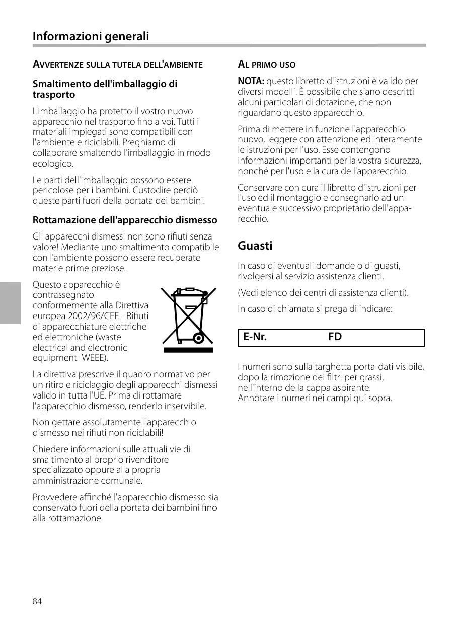FD I numeri sono sulla targhetta porta-dati visibile, dopo la rimozione dei filtri per grassi, nell'interno della cappa aspirante. Annotare i numeri nei campi qui sopra.