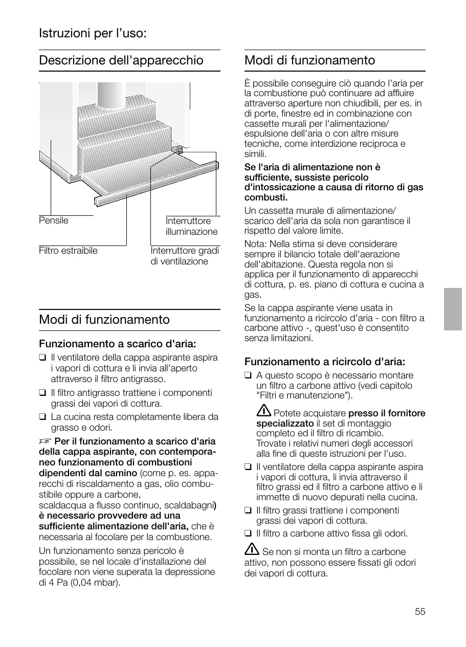 Istruzioni per l’uso: Descrizione dell'apparecchio Pensile Filtro estraibile Interruttore illuminazione Interruttore gradi di ventilazione Modi di funzionamento Funzionamento a scarico d'aria: ❑ Il ventilatore della cappa aspirante aspira i vapori di cottura e li invia all'aperto attraverso il filtro antigrasso. ❑ Il filtro antigrasso trattiene i componenti grassi dei vapori di cottura. ❑ La cucina resta completamente libera da grasso e odori. D Per il funzionamento a scarico d'aria della cappa aspirante, con contemporaneo funzionamento di combustioni dipendenti dal camino (come p. es. apparecchi di riscaldamento a gas, olio combustibile oppure a carbone, scaldacqua a flusso continuo, scaldabagni) è necessario provvedere ad una sufficiente alimentazione dell'aria, che è necessaria al focolare per la combustione. Un funzionamento senza pericolo è possibile, se nel locale d'installazione del focolare non viene superata la depressione di 4 Pa (0,04 mbar). Modi di funzionamento È possibile conseguire ciò quando l'aria per la combustione può continuare ad affluire attraverso aperture non chiudibili, per es. in di porte, finestre ed in combinazione con cassette murali per l'alimentazione/ espulsione dell'aria o con altre misure tecniche, come interdizione reciproca e simili. Se l'aria di alimentazione non è sufficiente, sussiste pericolo d'intossicazione a causa di ritorno di gas combusti. Un cassetta murale di alimentazione/ scarico dell'aria da sola non garantisce il rispetto del valore limite. Nota: Nella stima si deve considerare sempre il bilancio totale dell'aerazione dell'abitazione. Questa regola non si applica per il funzionamento di apparecchi di cottura, p. es. piano di cottura e cucina a gas. Se la cappa aspirante viene usata in funzionamento a ricircolo d'aria - con filtro a carbone attivo -, quest'uso è consentito senza limitazioni. Funzionamento a ricircolo d'aria: ❑ A questo scopo è necessario montare un filtro a carbone attivo (vedi capitolo "Filtri e manutenzione"). 몇 Potete acquistare presso il fornitore specializzato il set di montaggio completo ed il filtro di ricambio. Trovate i relativi numeri degli accessori alla fine di queste istruzioni per l'uso. ❑ Il ventilatore della cappa aspirante aspira i vapori di cottura, li invia attraverso il filtro grassi ed il filtro a carbone attivo e li immette di nuovo depurati nella cucina. ❑ Il filtro grassi trattiene i componenti grassi dei vapori di cottura. ❑ Il filtro a carbone attivo fissa gli odori.