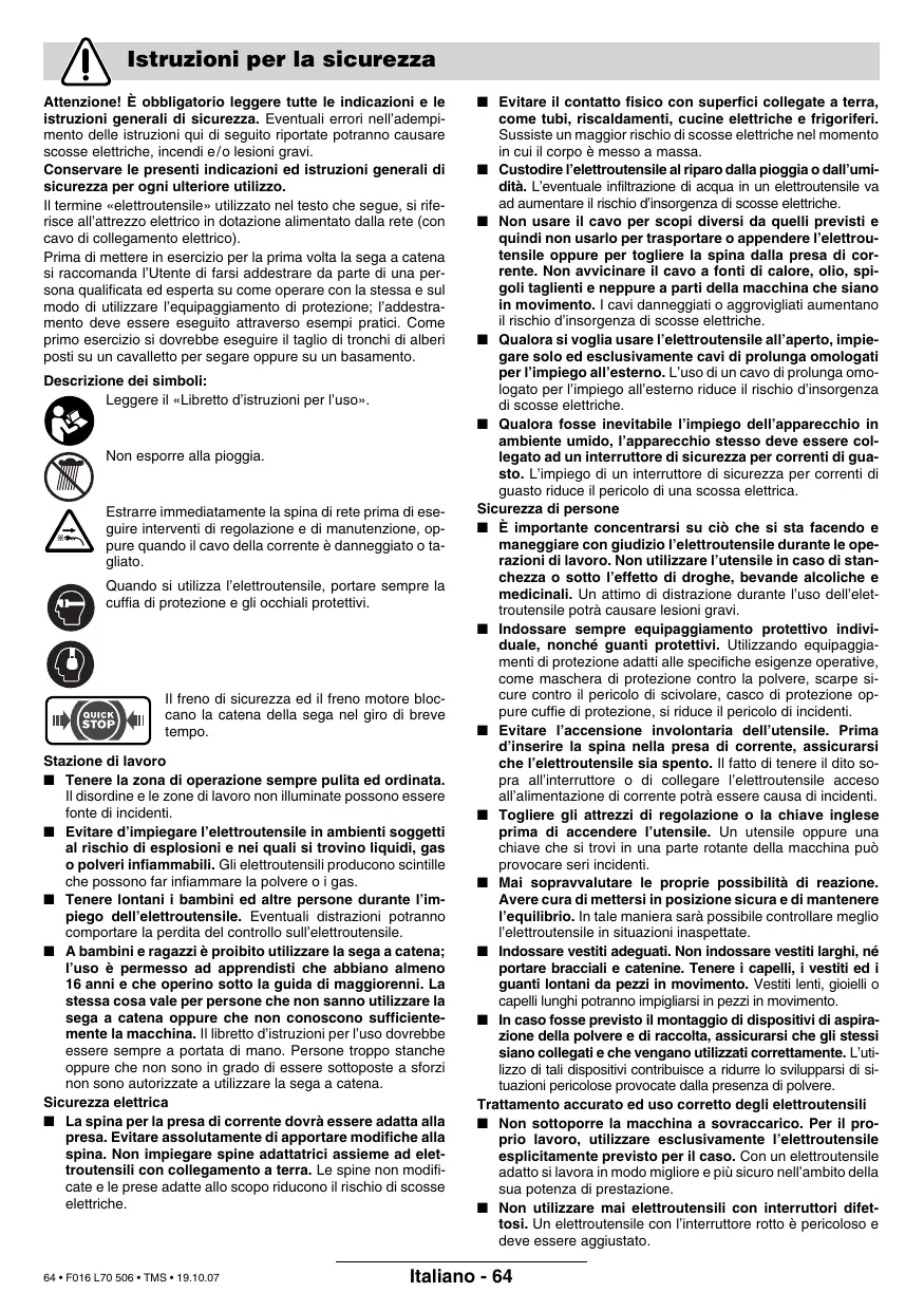 Prova di omologazione num. 210888100.01 CE attraverso stazione di collaudo notificata num. 0344. CE 2000/14: Il livello della potenza sonora L WA garantito è minore di 104 dB (A). Procedimento di valutazione della conformità secondo appendice V. Documentazione tecnica redatta da PT-LG/EAE – Stowmarket, Inghilterra. Als u de machine wilt uitschakelen, laat u de aan/ uit-schakelaar 2 los. Na het zagen mag de kettingzaag niet worden gestopt door het bedienen van de voorste handbescherming (activeren van de terugslagrem).