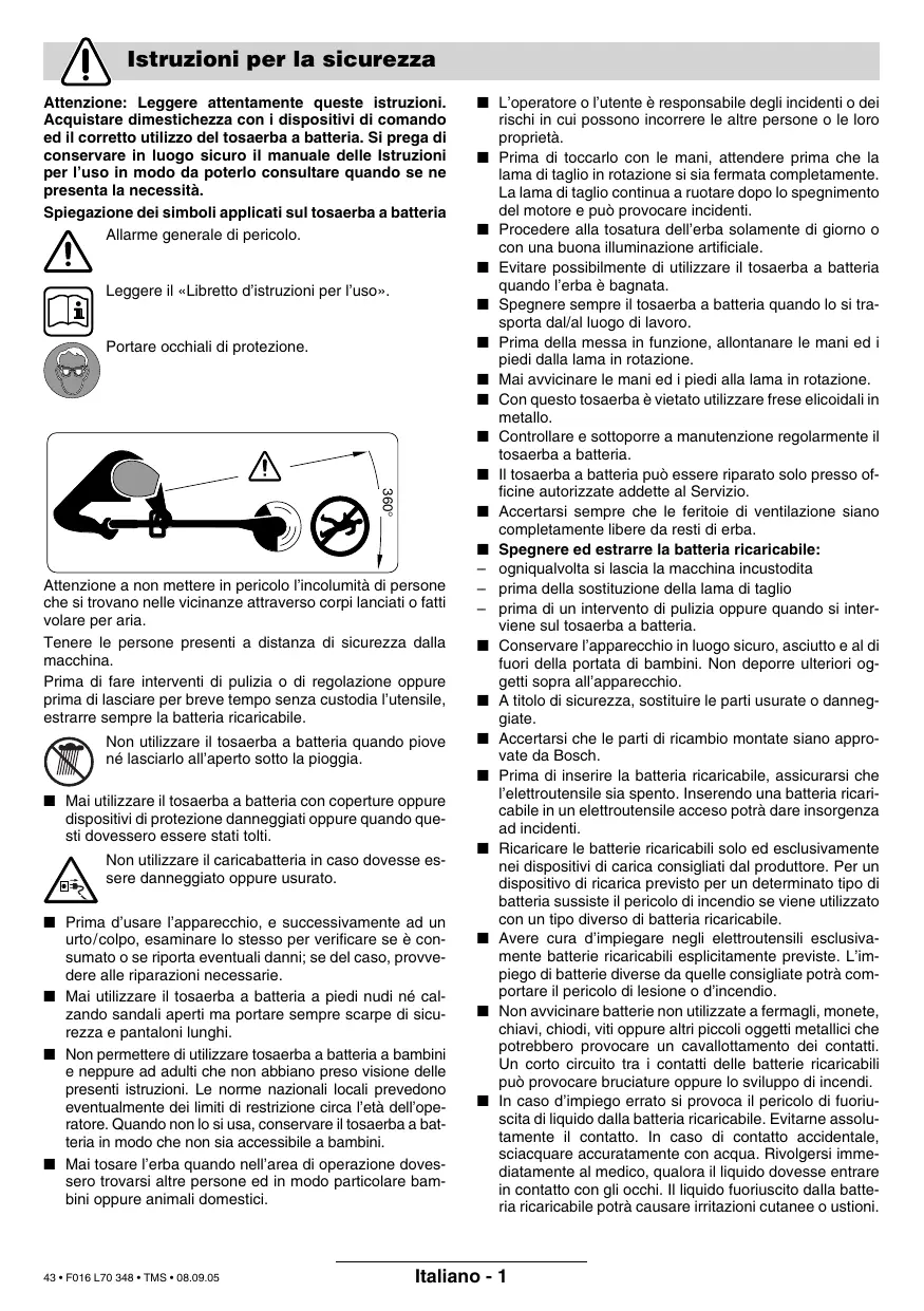 Garder une distance de sécurité entre l’utilisateur de la machine en marche et des personnes se trouvant à proximité. Toujours sortir l’accu avant de nettoyer l’appareil, de le ranger ou de le laisser sans surveillance même pour une courte durée. Ne pas utiliser et ne pas exposer le coupe-bordure à accu par temps de pluie. ■ Ne jamais utiliser le coupe-bordure à accu lorsque les couvertures ou dispositifs de protection sont endommagés, ou que ceux-ci ont été démontés. Ne pas utiliser le chargeur s’il est endommagé ou usé. ■ Avant d’utiliser l’appareil ou en cas de choc ou de chute, contrôler les éventuels dommages ou l’usure et, le cas échéant, effectuer les travaux de réparations. ■ Ne jamais faire fonctionner le coupe-bordure à accu si vous êtes pieds nus ou en sandalettes. Porter toujours des chaussures fermées et des pantalons longs. ■ Ne jamais laisser un enfant ou toute autre personne n’ayant pas pris connaissance des instructions d’utilisation se servir du coupe-bordure à accu. Des réglementations locales peuvent éventuellement fixer une limite d’âge inférieure quant à l’utilisateur. Garder le coupebordure à accu non utilisé hors de la portée des enfants. ■ Ne jamais utiliser le coupe-bordure lorsque des personnes, en particulier des enfants, ou des animaux domestiques se trouvent à proximité. ■ L’opérateur ou l’utilisateur de la tondeuse est responsable des accidents et des dommages causés à autrui ou à ses biens. 22 • F016 L70 348 • TMS • 08.09.05