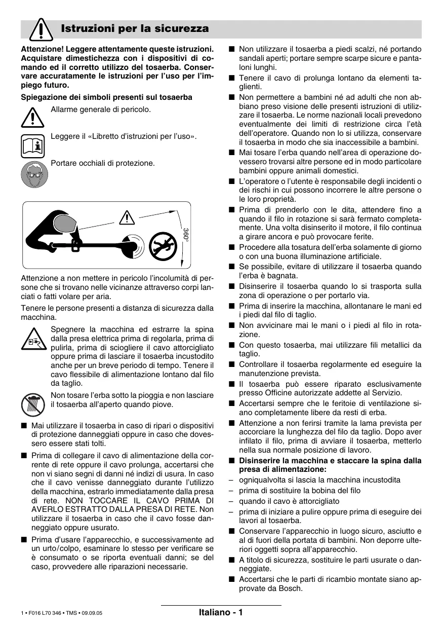 Português - 7 Istruzioni per la sicurezza Attenzione! Leggere attentamente queste istruzioni. Acquistare dimestichezza con i dispositivi di comando ed il corretto utilizzo del tosaerba. Conservare accuratamente le istruzioni per l’uso per l’impiego futuro. Spiegazione dei simboli presenti sul tosaerba Allarme generale di pericolo. Leggere il «Libretto d’istruzioni per l’uso». Portare occhiali di protezione. 360° Attenzione a non mettere in pericolo l’incolumità di persone che si trovano nelle vicinanze attraverso corpi lanciati o fatti volare per aria. Tenere le persone presenti a distanza di sicurezza dalla macchina. Spegnere la macchina ed estrarre la spina dalla presa elettrica prima di regolarla, prima di pulirla, prima di sciogliere il cavo attorcigliato oppure prima di lasciare il tosaerba incustodito anche per un breve periodo di tempo. Tenere il cavo flessibile di alimentazione lontano dal filo da taglio. Non tosare l’erba sotto la pioggia e non lasciare il tosaerba all’aperto quando piove. ■ Mai utilizzare il tosaerba in caso di ripari o dispositivi di protezione danneggiati oppure in caso che dovessero essere stati tolti. ■ Prima di collegare il cavo di alimentazione della corrente di rete oppure il cavo prolunga, accertarsi che non vi siano segni di danni né indizi di usura. In caso che il cavo venisse danneggiato durante l’utilizzo della macchina, estrarlo immediatamente dalla presa di rete. NON TOCCARE IL CAVO PRIMA DI AVERLO ESTRATTO DALLA PRESA DI RETE. Non utilizzare il tosaerba in caso che il cavo fosse danneggiato oppure usurato. ■ Prima d’usare l’apparecchio, e successivamente ad un urto/colpo, esaminare lo stesso per verificare se è consumato o se riporta eventuali danni; se del caso, provvedere alle riparazioni necessarie.