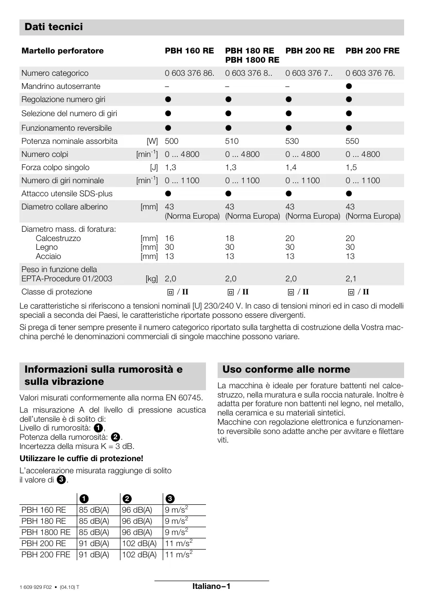 96 dB(A) 96 dB(A) 96 dB(A) 102 dB(A) 102 dB(A) La macchina è ideale per forature battenti nel calcestruzzo, nella muratura e sulla roccia naturale. Inoltre è adatta per forature non battenti nel legno, nel metallo, nella ceramica e su materiali sintetici. Macchine con regolazione elettronica e funzionamento reversibile sono adatte anche per avvitare e filettare viti.