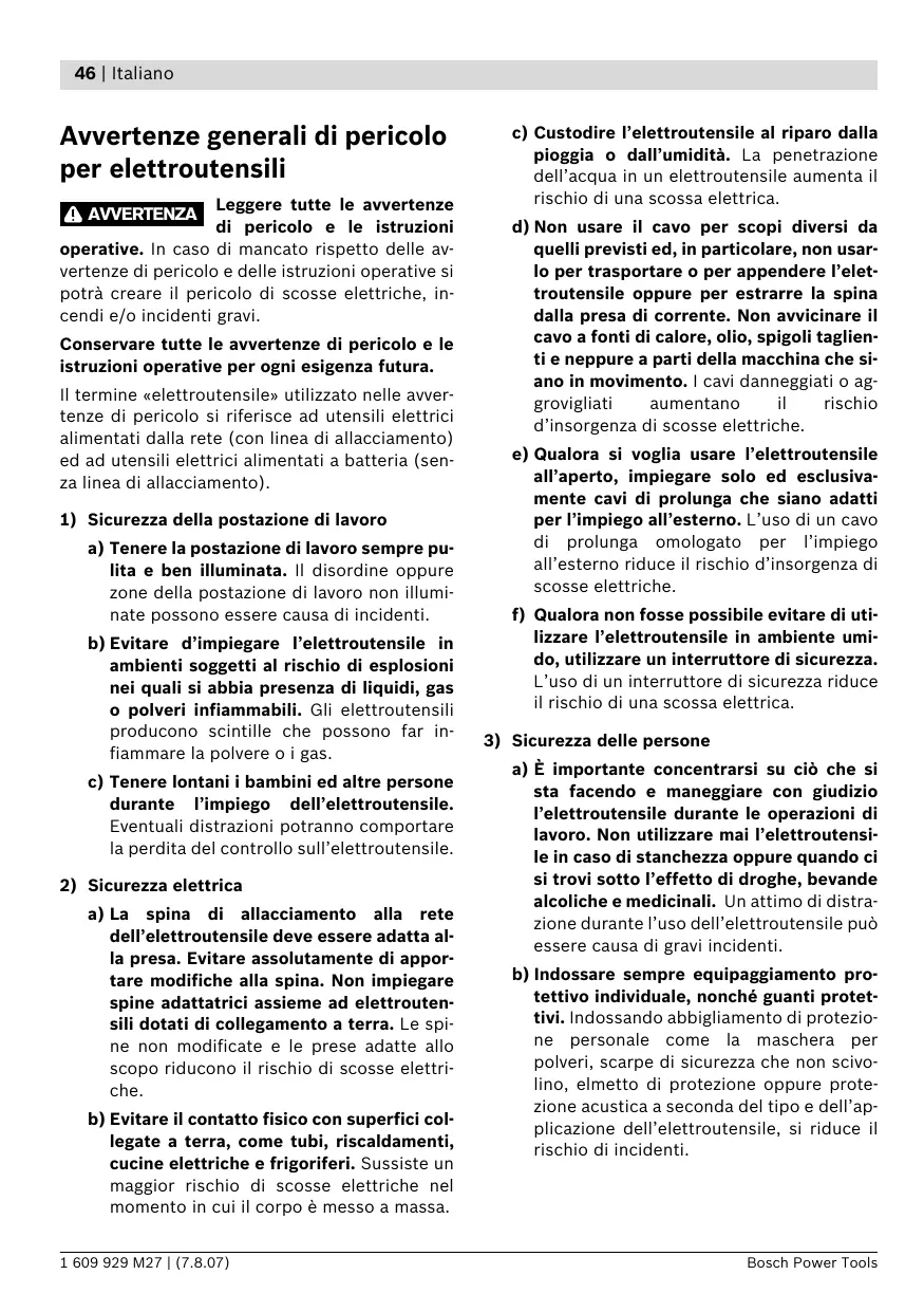 a) La spina di allacciamento alla rete dell’elettroutensile deve essere adatta alla presa. Evitare assolutamente di apportare modifiche alla spina. Non impiegare spine adattatrici assieme ad elettroutensili dotati di collegamento a terra. Le spine non modificate e le prese adatte allo scopo riducono il rischio di scosse elettriche. b) Evitare il contatto fisico con superfici collegate a terra, come tubi, riscaldamenti, cucine elettriche e frigoriferi. Sussiste un maggior rischio di scosse elettriche nel momento in cui il corpo è messo a massa. 1 609 929 M27 | (7.8.07) c) Custodire l’elettroutensile al riparo dalla pioggia o dall’umidità. La penetrazione dell’acqua in un elettroutensile aumenta il rischio di una scossa elettrica. d) Non usare il cavo per scopi diversi da quelli previsti ed, in particolare, non usarlo per trasportare o per appendere l’elettroutensile oppure per estrarre la spina dalla presa di corrente. Non avvicinare il cavo a fonti di calore, olio, spigoli taglienti e neppure a parti della macchina che siano in movimento. I cavi danneggiati o aggrovigliati aumentano rischio d’insorgenza di scosse elettriche. e) Qualora si voglia usare l’elettroutensile all’aperto, impiegare solo ed esclusivamente cavi di prolunga che siano adatti per l’impiego all’esterno. L’uso di un cavo di prolunga omologato per l’impiego all’esterno riduce il rischio d’insorgenza di scosse elettriche. f) Qualora non fosse possibile evitare di utilizzare l’elettroutensile in ambiente umido, utilizzare un interruttore di sicurezza. L’uso di un interruttore di sicurezza riduce il rischio di una scossa elettrica.