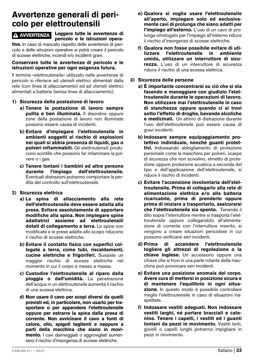 a) La spina di allacciamento alla rete dell’elettroutensile deve essere adatta alla presa. Evitare assolutamente di apportare modifiche alla spina. Non impiegare spine adattatrici assieme ad elettroutensili dotati di collegamento a terra. Le spine non modificate e le prese adatte allo scopo riducono il rischio di scosse elettriche. c) Evitare l’accensione involontaria dell’elettroutensile. Prima di collegarlo alla rete di alimentazione elettrica e/o alla batteria ricaricabile, prima di prenderlo oppure prima di iniziare a trasportarlo, assicurarsi che l’elettroutensile sia spento. Tenendo il dito sopra l’interruttore mentre si trasporta l’elettroutensile oppure collegandolo all’alimentazione di corrente con l’interruttore inserito, si vengono a creare situazioni pericolose in cui possono verificarsi seri incidenti. b) Evitare il contatto fisico con superfici collegate a terra, come tubi, riscaldamenti, cucine elettriche e frigoriferi. Sussiste un maggior rischio di scosse elettriche nel momento in cui il corpo è messo a massa. d) Prima di accendere l’elettroutensile togliere gli attrezzi di regolazione o la chiave inglese. Un accessorio oppure una chiave che si trovi in una parte rotante della macchina può provocare seri incidenti. c) Custodire l’elettroutensile al riparo dalla pioggia o dall’umidità. La penetrazione dell’acqua in un elettroutensile aumenta il rischio di una scossa elettrica. e) Evitare una posizione anomala del corpo. Avere cura di mettersi in posizione sicura e di mantenere l’equilibrio in ogni situazione. In questo modo è possibile controllare meglio l’elettroutensile in caso di situazioni inaspettate. d) Non usare il cavo per scopi diversi da quelli previsti ed, in particolare, non usarlo per trasportare o per appendere l’elettroutensile oppure per estrarre la spina dalla presa di corrente. Non avvicinare il cavo a fonti di calore, olio, spigoli taglienti e neppure a parti della macchina che siano in movimento. I cavi danneggiati o aggrovigliati aumentano il rischio d’insorgenza di scosse elettriche. 2 609 002 311 • 8.5.07 f) Indossare vestiti adeguati. Non indossare vestiti larghi, né portare bracciali e catenine. Tenere i capelli, i vestiti ed i guanti lontani da pezzi in movimento. Vestiti lenti, gioielli o capelli lunghi potranno impigliarsi in pezzi in movimento. Italiano | 33 g) In caso fosse previsto il montaggio di dispositivi di aspirazione della polvere e di raccolta, assicurarsi che gli stessi siano collegati e che vengano utilizzati correttamente. L’utilizzo di un’aspirazione polvere può ridurre lo svilupparsi di situazioni pericolose dovute alla polvere.