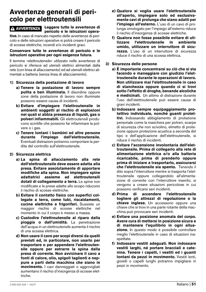 électrique. f) Si l’usage d’un outil dans un emplacement humide est inévitable, utiliser une alimentation protégée par un dispositif à courant différentiel résiduel (RCD). L’usage d’un RCD réduit le risque de choc électrique. 3) Sécurité des personnes a) Rester vigilant, regarder ce que vous êtes en train de faire et faire preuve de bon sens dans votre utilisation de l’outil. Ne pas utiliser un outil lorsque vous êtes fatigué ou sous l’emprise de drogues, d’alcool ou de médicaments. Un moment d’inattention en cours d’utilisation d’un outil peut entraîner des blessures graves des personnes. b) Utiliser un équipement de sécurité. Toujours porter une protection pour les yeux. Les équipements de sécurité tels que les masques contre les poussières, les chaussures de sécurité antidérapantes, les casques ou les protections acoustiques utilisés pour les conditions appropriées réduiront les blessures de personnes. c) Eviter tout démarrage intempestif. S’assurer que l’interrupteur est en position arrêt avant de brancher l’outil au secteur et/ou au bloc de batteries, de le ramasser ou de le porter. Porter les outils en ayant le doigt sur l’interrupteur ou brancher des outils dont l’interrupteur est en position marche est source d’accidents. d) Retirer toute clé de réglage avant de mettre l’outil en marche. Une clé laissée fixée sur une partie tournante de l’outil peut donner lieu à des blessures de personnes. e) Ne pas se précipiter. Garder une position et un équilibre adaptés à tout moment. Cela permet un meilleur contrôle de l’outil dans des situations inattendues. f) S’habiller de manière adaptée. Ne pas porter de vêtements amples ou de bijoux. Garder les cheveux, les vêtements et les gants à distance des parties en mouvement. Des vêtements amples, des bijoux ou les cheveux longs peuvent être pris dans des parties en mouvement. g) Si des dispositifs sont fournis pour le raccordement d’équipements pour l’extraction et la récupération des poussières, s’assurer qu’ils sont connectés et correctement utilisés. Utiliser des collecteurs de poussière peut réduire les risques dus aux poussières. 2 609 002 333 • 5.6.07
