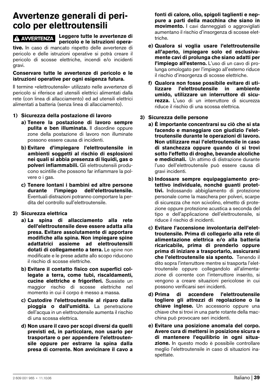 a) La spina di allacciamento alla rete dell’elettroutensile deve essere adatta alla presa. Evitare assolutamente di apportare modifiche alla spina. Non impiegare spine adattatrici assieme ad elettroutensili dotati di collegamento a terra. Le spine non modificate e le prese adatte allo scopo riducono il rischio di scosse elettriche. b) Evitare il contatto fisico con superfici collegate a terra, come tubi, riscaldamenti, cucine elettriche e frigoriferi. Sussiste un maggior rischio di scosse elettriche nel momento in cui il corpo è messo a massa. c) Custodire l’elettroutensile al riparo dalla pioggia o dall’umidità. La penetrazione dell’acqua in un elettroutensile aumenta il rischio di una scossa elettrica. d) Non usare il cavo per scopi diversi da quelli previsti ed, in particolare, non usarlo per trasportare o per appendere l’elettroutensile oppure per estrarre la spina dalla presa di corrente. Non avvicinare il cavo a 2 609 001 965 • 11.10.06 fonti di calore, olio, spigoli taglienti e neppure a parti della macchina che siano in movimento. I cavi danneggiati o aggrovigliati aumentano il rischio d’insorgenza di scosse elettriche. e) Qualora si voglia usare l’elettroutensile all’aperto, impiegare solo ed esclusivamente cavi di prolunga che siano adatti per l’impiego all’esterno. L’uso di un cavo di prolunga omologato per l’impiego all’esterno riduce il rischio d’insorgenza di scosse elettriche. f) Qualora non fosse possibile evitare di utilizzare l’elettroutensile in ambiente umido, utilizzare un interruttore di sicurezza. L’uso di un interruttore di sicurezza riduce il rischio di una scossa elettrica.