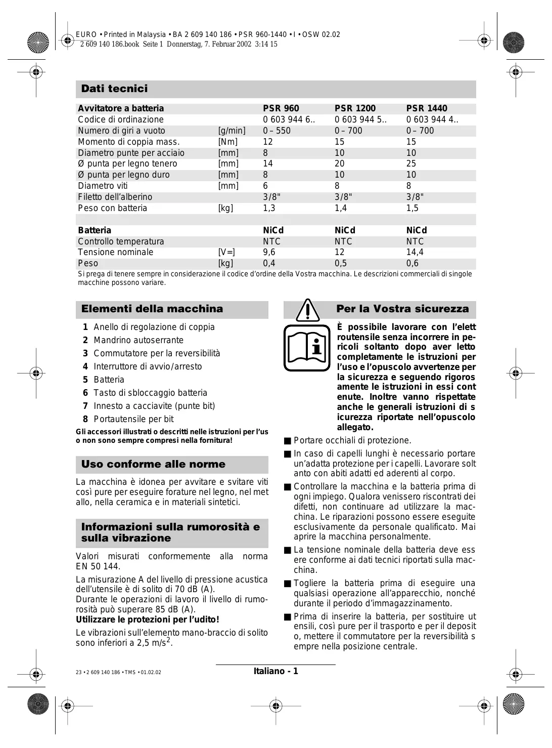 È possibile lavorare con l’elett routensile senza incorrere in pericoli soltanto dopo aver letto completamente le istruzioni per l’uso e l’opuscolo avvertenze per la sicurezza e seguendo rigoros amente le istruzioni in essi cont enute. Inoltre vanno rispettate anche le generali istruzioni di s icurezza riportate nell’opuscolo allegato. Portare occhiali di protezione. In caso di capelli lunghi è necessario portare un’adatta protezione per i capelli. Lavorare solt anto con abiti adatti ed aderenti al corpo. Controllare la macchina e la batteria prima di ogni impiego. Qualora venissero riscontrati dei difetti, non continuare ad utilizzare la macchina. Le riparazioni possono essere eseguite esclusivamente da personale qualificato. Mai aprire la macchina personalmente. La tensione nominale della batteria deve ess ere conforme ai dati tecnici riportati sulla macchina. Togliere la batteria prima di eseguire una qualsiasi operazione all’apparecchio, nonché durante il periodo d’immagazzinamento. Prima di inserire la batteria, per sostituire ut ensili, così pure per il trasporto e per il deposit o, mettere il commutatore per la reversibilità s empre nella posizione centrale. Italiano - 1 EURO • Printed in Malaysia • BA 2 609 140 186 • PSR 960-1440 • I • OSW 02.02 2 609 140 186.book Seite 2 Donnerstag, 7. Februar 2002 3:14 15 ■ Prima di utilizzare la macchina, assicurarsi che la batteria sia ben inserita nell’apposito vano. ■ Non sottoporre la macchina a carico tanto elevato da farla fermare. ■ Mantenere saldamente la macchina: serrando a fondo è possibile che si verifichino alti momenti di reazione di breve durata. ■ Mai permettere a bambini di utilizzare la macchina. ■ La Bosch può garantire un perfetto funzionamento della macchina soltanto se vengono ut ilizzati accessori originali specificatamente previsti per questa macchina. Batteria e stazione di ricarica ■ È estremamente indispensabile leggere le allegate istruzioni per l’uso relative alla st azione di ricarica! ■ La batteria e la stazione di ricarica della batt eria sono adattati reciprocamente. Per operazioni di ricarica utilizzare esclusivamente un’apposita stazione di ricarica Bosch- dotata di tensione adatta alla batteria ricaricabile (vedere targhetta di costruzione). Combinando diverse tensioni nominali si danneggia la batt eria o la stazione di ricarica. ■ Prima di procedere all’operazione di ricarica, far raffreddare le batterie surriscaldate. ■ Proteggere la batteria da surriscaldamento e da fiamme: Pericolo di esplosione! Non poggiare le batterie su termosifoni, né esporle a lungo all’azione diretta dei raggi solari: temperature superiori a 50 °C provocano danni. ■ Non aprire la batteria e proteggerla contro gli urti. Conservarla in luogo asciutto e protetto contro il gelo. ■ Coprire i contatti della batteria estratta. In cas o di cortocircuito dovuto a ponti metallici, esist e il pericolo di incendio e di esplosione! ■ Non buttare la batteria tra i rifiuti domestici, né nel fuoco, né nell’acqua. 24 • 2 609 140 186 • TMS • 01.02.02 Prima della messa in esercizio Caricare la batteria Una batteria che non sia stata utilizzata per un lungo periodo di tempo arriva a portare la sua piena prestazione solo dopo ca. 5 cicli di ricarica e scarica. Per togliere le batterie ricaricabili 5, premere i tas ti di sbloccaggio 6 ed estrarre la batteria ricaricabile tirandola verso il basso. Non forzare. La batteria è equipaggiata con un dispositivo di controllo della temperatura NTC, che permette l’operazione di ricarica soltanto entro valori di t emperatura compresi tra 0 °C e 45 °C. In questo modo si raggiunge un’elevata durata della batt eria. Una durata di funzionamento della batteria che con ogni operazione di ricarica diventa sempre più breve sta ad indicare che le batterie sono us urate e che devono essere sostituite. ■ Osservare le istruzioni relative alla protezione dell’ambiente. Cambio degli utensili Aprire il mandrino portapunta fino a quando sarà possibile applicarvi l’utensile. Inserire l’utensile. Tenere ferma la boccola posteriore ed avvitare forte manualmente la boccola anteriore fino a quando non sarà più percettibile nessuno scatto («klick»). In questo modo il mandrino portapunta viene bloccato automaticamente. Lo sbloccaggio avviene quando, per togliere l’ut ensile, la boccola anteriore viene girata in senso contrario. Avvitatura (vedere illustrazioni