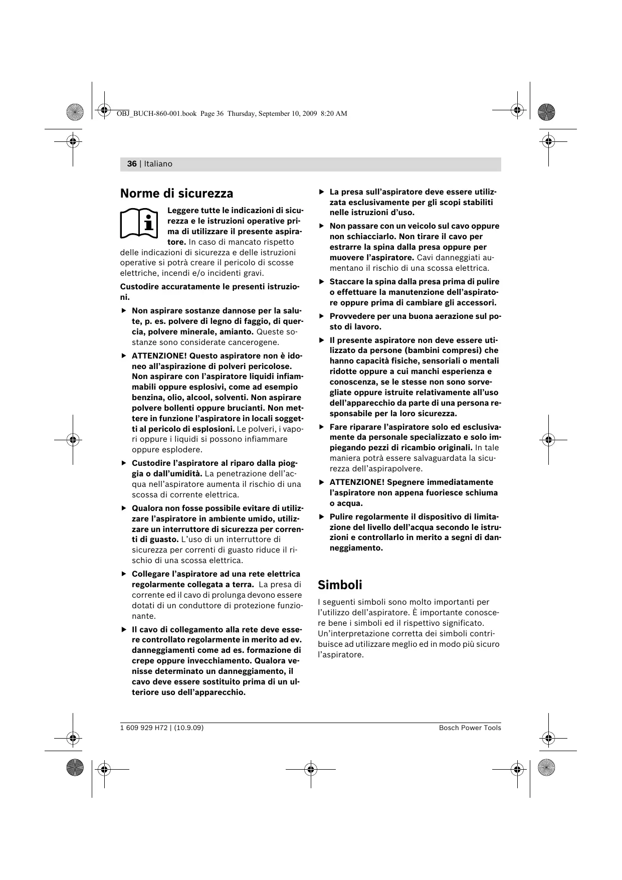 Leggere tutte le indicazioni di sicurezza e le istruzioni operative prima di utilizzare il presente aspiratore. In caso di mancato rispetto delle indicazioni di sicurezza e delle istruzioni operative si potrà creare il pericolo di scosse elettriche, incendi e/o incidenti gravi. Custodire accuratamente le presenti istruzioni. f Non aspirare sostanze dannose per la salute, p. es. polvere di legno di faggio, di quercia, polvere minerale, amianto. Queste sostanze sono considerate cancerogene. f ATTENZIONE! Questo aspiratore non è idoneo all’aspirazione di polveri pericolose. Non aspirare con l’aspiratore liquidi infiammabili oppure esplosivi, come ad esempio benzina, olio, alcool, solventi. Non aspirare polvere bollenti oppure brucianti. Non mettere in funzione l’aspiratore in locali soggetti al pericolo di esplosioni. Le polveri, i vapori oppure i liquidi si possono infiammare oppure esplodere. f Custodire l’aspiratore al riparo dalla pioggia o dall’umidità. La penetrazione dell’acqua nell’aspiratore aumenta il rischio di una scossa di corrente elettrica. f Qualora non fosse possibile evitare di utilizzare l’aspiratore in ambiente umido, utilizzare un interruttore di sicurezza per correnti di guasto. L’uso di un interruttore di sicurezza per correnti di guasto riduce il rischio di una scossa elettrica. f Collegare l’aspiratore ad una rete elettrica regolarmente collegata a terra. La presa di corrente ed il cavo di prolunga devono essere dotati di un conduttore di protezione funzionante. f Il cavo di collegamento alla rete deve essere controllato regolarmente in merito ad ev. danneggiamenti come ad es. formazione di crepe oppure invecchiamento. Qualora venisse determinato un danneggiamento, il cavo deve essere sostituito prima di un ulteriore uso dell’apparecchio. 1 609 929 H72 | (10.9.09) f La presa sull’aspiratore deve essere utilizzata esclusivamente per gli scopi stabiliti nelle istruzioni d’uso. f Non passare con un veicolo sul cavo oppure non schiacciarlo. Non tirare il cavo per estrarre la spina dalla presa oppure per muovere l’aspiratore. Cavi danneggiati aumentano il rischio di una scossa elettrica. f Staccare la spina dalla presa prima di pulire o effettuare la manutenzione dell’aspiratore oppure prima di cambiare gli accessori. f Provvedere per una buona aerazione sul posto di lavoro. f Il presente aspiratore non deve essere utilizzato da persone (bambini compresi) che hanno capacità fisiche, sensoriali o mentali ridotte oppure a cui manchi esperienza e conoscenza, se le stesse non sono sorvegliate oppure istruite relativamente all’uso dell’apparecchio da parte di una persona responsabile per la loro sicurezza. f Fare riparare l’aspiratore solo ed esclusivamente da personale specializzato e solo impiegando pezzi di ricambio originali. In tale maniera potrà essere salvaguardata la sicurezza dell’aspirapolvere. f ATTENZIONE! Spegnere immediatamente l’aspiratore non appena fuoriesce schiuma o acqua. f Pulire regolarmente il dispositivo di limitazione del livello dell’acqua secondo le istruzioni e controllarlo in merito a segni di danneggiamento. Simboli I seguenti simboli sono molto importanti per l’utilizzo dell’aspiratore. È importante conoscere bene i simboli ed il rispettivo significato. Un’interpretazione corretta dei simboli contribuisce ad utilizzare meglio ed in modo più sicuro l’aspiratore. Bosch Power Tools OBJ_BUCH-860-001.book Page 37 Thursday, September 10, 2009 8:20 AM Italiano | 37 Simbolo Significato Leggere tutte le indicazioni di sicurezza e le istruzioni operative prima di utilizzare il presente aspiratore. In caso di mancato rispetto delle indicazioni di sicurezza e delle istruzioni operative si potrà creare il pericolo di scosse elettriche, incendi e/o incidenti gravi. ATTENZIONE 11 Filtro permanente 12 Galleggiante 13 Supporto per accessori 14 Sacchetto per la polvere 15 Cestello in plastica *L’accessorio illustrato oppure descritto non è compreso nel volume di fornitura standard. L’accessorio completo è contenuto nel nostro programma accessori. Informazioni sulla rumorosità e sulla vibrazione Descrizione del funzionamento Valori misurati conformemente alla norma EN 60704. Uso conforme alle norme La misurazione A del livello di pressione acustica dell’aspiratore è solitamente di 77 dB(A). Incertezza della misura K=3 dB. L’apparecchio è idoneo per aspirare ed eliminare sostanze che non siano nocive per la salute e liquidi non infiammabili. BIA categoria polvere Utilizzare l’aspiratore esclusivamente se sono state completamente valutate tutte le funzioni e possono essere effettuate senza limitazioni oppure sono state mantenute le relative istruzioni. Dichiarazione di conformità Assumendone la piena responsabilità, dichiariamo che il prodotto descritto nei «Dati tecnici» è conforme alle seguenti normative ed ai relativi documenti: EN 60335 in base alle prescrizioni delle direttive 2006/95/CE, 2004/108/CE.