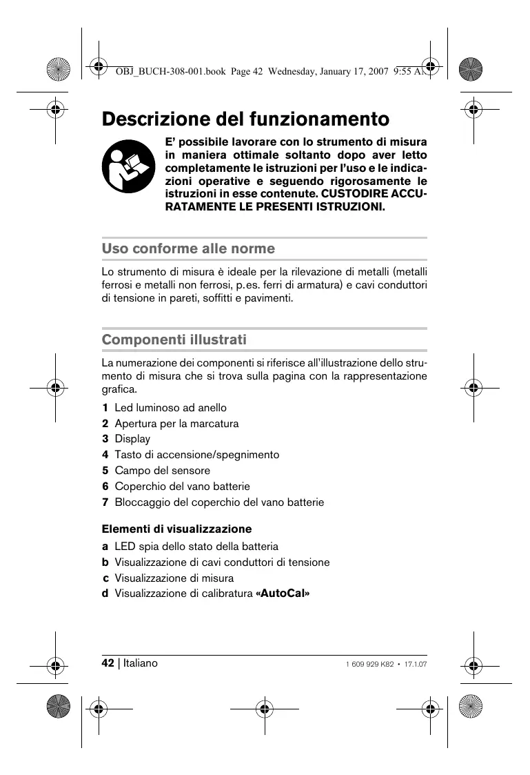 - a seconda del materiale e della dimensione degli oggetti nonché del materiale e dello stato della base ** ridotta profondità di localizzazione in caso di cavi non conduttori di tensione Si prega di tener presente il codice prodotto applicato sulla targhetta di costruzione del Vostro strumento di misura perché le denominazioni commerciali di singoli strumenti di misura possono variare. Montaggio Applicazione/sostituzione delle batterie Utilizzare esclusivamente batterie all’alcale-manganese oppure batterie ricaricabili. Per aprire il coperchio del vano batterie 6 premere il bloccaggio 7 in direzione della freccia e ribaltare il coperchio del vano batterie verso il basso. Inserire le batterie fornite in dotazione, facendo attenzione alla polarizzazione corretta. 1 609 929 K82 • 17.1.07 Italiano | 43 OBJ_BUCH-308-001.book Page 44 Wednesday, January 17, 2007 9:55 AM Se l’indicazione dello stato della batteria a sul display si accende significa che utilizzando batterie alcaline si possono eseguire misurazioni per ancora 1 ora ca. (con batterie ricaricabili si ha una durata inferiore). Se la visualizzazione lampeggia a significa che si hanno a disposizione solo 10 min ca. di misurazioni. Se l’indicazione relativa allo stato della batteria a ed il led luminoso ad anello 1 (rosso) lampeggiano, questo significa che non è più possibile eseguire ulteriori misurazioni previa sostituzione della batteria alcalina o di quella ricaricabile. f In caso di non utilizzo per lunghi periodi estrarre la batteria dallo strumento di misura. In caso di lunghi periodi di deposito, la batteria può subire corrosioni oppure si può scaricare. Uso Messa in funzione f Proteggere lo strumento di misura da liquidi e dall’esposizione diretta ai raggi solari. Accendere/spegnere f Prima di mettere in funzione lo strumento di misura accertarsi che il campo del sensore 5 non sia umido. In tal caso si consiglia di utilizzare un panno di stoffa per asciugare lo strumento. f Se lo strumento di misura dovesse essere stato sottoposto a sbalzi di temperatura, si consiglia prima di accenderlo di nuovo di attendere che torni ad una temperatura normale. Per l’accensione dello strumento di misura premere il tasto di accensione/spegnimento 4. Dopo un breve autotest, lo strumento di misura è pronto all’uso. La prontezza per l’uso viene indicata da un segno di visto dietro la visualizzazione di calibratura «AutoCal» d. Per spegnere lo strumento di misura premere il tasto di inserimento/disinserimento 4. Se entro ca. 10 minuti non avviene alcuna misurazione, lo strumento di misura si spegne automaticamente per proteggere le batterie. 44 | Italiano 1 609 929 K82 • 17.1.07 OBJ_BUCH-308-001.book Page 45 Wednesday, January 17, 2007 9:55 AM Modi operativi Lo strumento di misura rileva oggetti che si trovano al di sotto del campo del sensore 5. Rilevazione di oggetti metallici Dopo l’accensione l’anello luminoso 1 è illuminato in verde. Applicare lo strumento di misura sulla superficie da controllare e muoverlo lateralmente. Se l’anello luminoso 1 continua a rimanere illuminato in verde e non viene emesso alcun suono di segnalazione, nel settore controllato non è individuabile alcun oggetto metallico. Quando lo strumento di misura si avvicina ad un oggetto metallico, aumenta la deviazione nella visualizzazione di misura c. Sopra un oggetto metallico l’anello luminoso 1 diventa rosso e viene emesso un suono di segnalazione. Durante il primo passaggio sopra l’oggetto metallico la sua posizione viene indicata solo in modo grossolano. Passando più volte con lo strumento di misura sopra l’oggetto metallico, la rilevazione dell’oggetto stesso diventa sempre più precisa Dopo ripetuti passaggi (senza sollevare l’attrezzo di misura dal settore di controllo), la posizione dell’oggetto metallico può essere indicata in modo preciso. Se l’anello luminoso 1 è illuminato in rosso ed il suono di segnalazione continua ad essere emesso, l’oggetto metallico è situato al di sotto del centro del sensore (al di sotto dell'apertura per la marcatura 2). Rilevazione di cavi conduttori di tensione Lo strumento di misura indica cavi che conducono tensione tra 110 V e 400 V e la cui frequenza corrisponde allo standard ampiamente diffuso (corrente alternata con 50 oppure 60 Hz). Altri cavi (corrente continua, frequenza maggiore/inferiore oppure tensione) e cavi non conduttori di tensione non possono essere rilevati in modo affidabile, gli stessi vengono eventualmente visualizzati come oggetti metallici. 1 609 929 K82 • 17.1.07 Italiano | 45 OBJ_BUCH-308-001.book Page 46 Wednesday, January 17, 2007 9:55 AM La rilevazione di cavi conduttori di tensione avviene automaticamente ad ogni misurazione. Se viene individuato un cavo conduttore di tensione, compare sul display la visualizzazione b. Muovere ripetutamente lo strumento di misura sopra il settore da controllare per localizzare in modo più preciso il cavo conduttore di tensione. Dopo ripetuti passaggi, la posizione del cavo conduttore di tensione può essere indicata in modo molto preciso. Quando lo strumento di misura è molto vicino al cavo, l’anello luminoso 1 lampeggia in rosso ed il suono di segnalazione viene emesso con sequenza di suoni più veloce. L’identificazione di cavi conduttori di tensione diventa più facile collegando ed accendendo utenze elettriche (ad es. sistemi di illuminazione, apparecchiature) al cavo che si vuole localizzare. Le linee con 110 V, 230 V e 400 V (corrente trifase) vengono rilevate all'incirca con lo stesso potenziale di rilevazione. In determinate condizioni (come p.es. dietro superfici metalliche oppure dietro superfici con elevato contenuto di acqua), i cavi conduttori di tensione non possono essere rilevati in modo sicuro. Se sopra un grande settore viene indicato ovunque un valore di misura c, significa che il materiale scherma elettricamente e l’individuazione di cavi conduttori di tensione non è affidabile. Indic