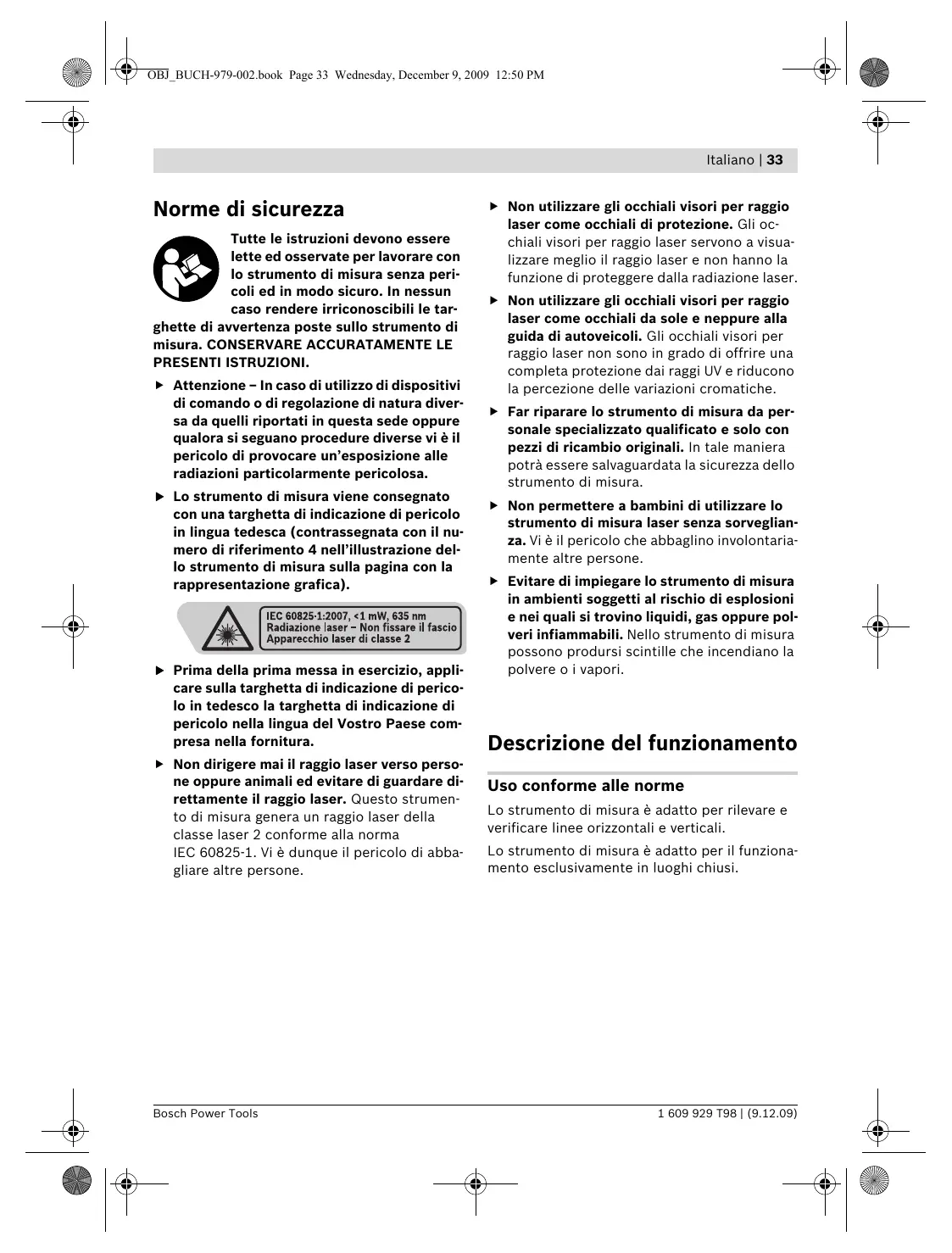 Tutte le istruzioni devono essere lette ed osservate per lavorare con lo strumento di misura senza pericoli ed in modo sicuro. In nessun caso rendere irriconoscibili le targhette di avvertenza poste sullo strumento di misura. CONSERVARE ACCURATAMENTE LE PRESENTI ISTRUZIONI. f Attenzione – In caso di utilizzo di dispositivi di comando o di regolazione di natura diversa da quelli riportati in questa sede oppure qualora si seguano procedure diverse vi è il pericolo di provocare un’esposizione alle radiazioni particolarmente pericolosa. f Lo strumento di misura viene consegnato con una targhetta di indicazione di pericolo in lingua tedesca (contrassegnata con il numero di riferimento 4 nell’illustrazione dello strumento di misura sulla pagina con la rappresentazione grafica). f Prima della prima messa in esercizio, applicare sulla targhetta di indicazione di pericolo in tedesco la targhetta di indicazione di pericolo nella lingua del Vostro Paese compresa nella fornitura. f Non dirigere mai il raggio laser verso persone oppure animali ed evitare di guardare direttamente il raggio laser. Questo strumento di misura genera un raggio laser della classe laser 2 conforme alla norma IEC 60825-1. Vi è dunque il pericolo di abbagliare altre persone. Bosch Power Tools f Non utilizzare gli occhiali visori per raggio laser come occhiali di protezione. Gli occhiali visori per raggio laser servono a visualizzare meglio il raggio laser e non hanno la funzione di proteggere dalla radiazione laser. f Non utilizzare gli occhiali visori per raggio laser come occhiali da sole e neppure alla guida di autoveicoli. Gli occhiali visori per raggio laser non sono in grado di offrire una completa protezione dai raggi UV e riducono la percezione delle variazioni cromatiche. f Far riparare lo strumento di misura da personale specializzato qualificato e solo con pezzi di ricambio originali. In tale maniera potrà essere salvaguardata la sicurezza dello strumento di misura. f Non permettere a bambini di utilizzare lo strumento di misura laser senza sorveglianza. Vi è il pericolo che abbaglino involontariamente altre persone. f Evitare di impiegare lo strumento di misura in ambienti soggetti al rischio di esplosioni e nei quali si trovino liquidi, gas oppure polveri infiammabili. Nello strumento di misura possono prodursi scintille che incendiano la polvere o i vapori. Descrizione del funzionamento Uso conforme alle norme Lo strumento di misura è adatto per rilevare e verificare linee orizzontali e verticali. Lo strumento di misura è adatto per il funzionamento esclusivamente in luoghi chiusi. 1 609 929 T98 | (9.12.09) OBJ_BUCH-979-002.book Page 34 Wednesday, December 9, 2009 12:50 PM 34 | Italiano Componenti illustrati La numerazione dei componenti si riferisce all’illustrazione dello strumento di misura che si trova sulla pagina con la rappresentazione grafica. 1 Uscita del raggio laser 2 Interruttore di avvio/arresto Dati tecnici Livella laser multifunzione Codice prodotto Campo operativo (diametro) fino a ca. 1) PLL 360 3 603 F63 000 20 m ±0,4 mm/m 3 Attacco treppiede 1/4" Precisione di livellamento 4 Targhetta di indicazione di pericolo del raggio laser Campo di autolivellamento tipico ±4° 5 Coperchio del vano batterie 6 Bloccaggio del coperchio del vano batterie Tempo di autolivellamento tipico