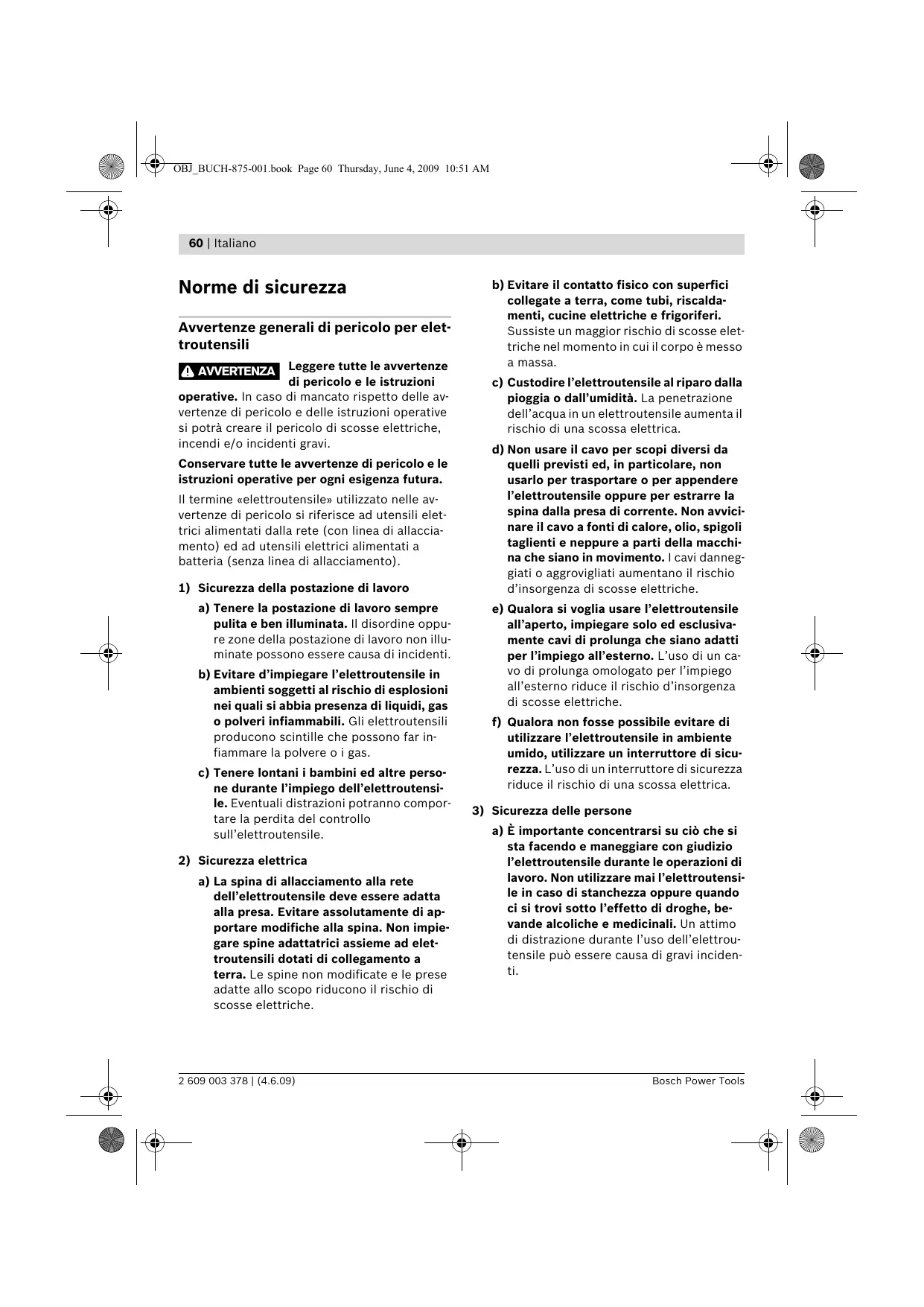 a) La spina di allacciamento alla rete dell’elettroutensile deve essere adatta alla presa. Evitare assolutamente di apportare modifiche alla spina. Non impiegare spine adattatrici assieme ad elettroutensili dotati di collegamento a terra. Le spine non modificate e le prese adatte allo scopo riducono il rischio di scosse elettriche. 2 609 003 378 | (4.6.09) b) Evitare il contatto fisico con superfici collegate a terra, come tubi, riscaldamenti, cucine elettriche e frigoriferi. Sussiste un maggior rischio di scosse elettriche nel momento in cui il corpo è messo a massa. c) Custodire l’elettroutensile al riparo dalla pioggia o dall’umidità. La penetrazione dell’acqua in un elettroutensile aumenta il rischio di una scossa elettrica. d) Non usare il cavo per scopi diversi da quelli previsti ed, in particolare, non usarlo per trasportare o per appendere l’elettroutensile oppure per estrarre la spina dalla presa di corrente. Non avvicinare il cavo a fonti di calore, olio, spigoli taglienti e neppure a parti della macchina che siano in movimento. I cavi danneggiati o aggrovigliati aumentano il rischio d’insorgenza di scosse elettriche. e) Qualora si voglia usare l’elettroutensile all’aperto, impiegare solo ed esclusivamente cavi di prolunga che siano adatti per l’impiego all’esterno. L’uso di un cavo di prolunga omologato per l’impiego all’esterno riduce il rischio d’insorgenza di scosse elettriche. f) Qualora non fosse possibile evitare di utilizzare l’elettroutensile in ambiente umido, utilizzare un interruttore di sicurezza. L’uso di un interruttore di sicurezza riduce il rischio di una scossa elettrica.