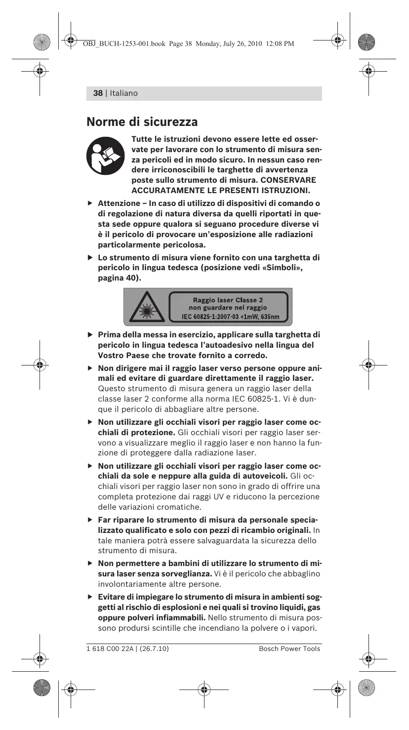 Tutte le istruzioni devono essere lette ed osservate per lavorare con lo strumento di misura senza pericoli ed in modo sicuro. In nessun caso rendere irriconoscibili le targhette di avvertenza poste sullo strumento di misura. CONSERVARE ACCURATAMENTE LE PRESENTI ISTRUZIONI. f Attenzione – In caso di utilizzo di dispositivi di comando o di regolazione di natura diversa da quelli riportati in questa sede oppure qualora si seguano procedure diverse vi è il pericolo di provocare un’esposizione alle radiazioni particolarmente pericolosa. f Lo strumento di misura viene fornito con una targhetta di pericolo in lingua tedesca (posizione vedi «Simboli», pagina 40). f Prima della messa in esercizio, applicare sulla targhetta di pericolo in lingua tedesca l’autoadesivo nella lingua del Vostro Paese che trovate fornito a corredo. f Non dirigere mai il raggio laser verso persone oppure animali ed evitare di guardare direttamente il raggio laser. Questo strumento di misura genera un raggio laser della classe laser 2 conforme alla norma IEC 60825-1. Vi è dunque il pericolo di abbagliare altre persone. f Non utilizzare gli occhiali visori per raggio laser come occhiali di protezione. Gli occhiali visori per raggio laser servono a visualizzare meglio il raggio laser e non hanno la funzione di proteggere dalla radiazione laser. f Non utilizzare gli occhiali visori per raggio laser come occhiali da sole e neppure alla guida di autoveicoli. Gli occhiali visori per raggio laser non sono in grado di offrire una completa protezione dai raggi UV e riducono la percezione delle variazioni cromatiche. f Far riparare lo strumento di misura da personale specializzato qualificato e solo con pezzi di ricambio originali. In tale maniera potrà essere salvaguardata la sicurezza dello strumento di misura. f Non permettere a bambini di utilizzare lo strumento di misura laser senza sorveglianza. Vi è il pericolo che abbaglino involontariamente altre persone. f Evitare di impiegare lo strumento di misura in ambienti soggetti al rischio di esplosioni e nei quali si trovino liquidi, gas oppure polveri infiammabili. Nello strumento di misura possono prodursi scintille che incendiano la polvere o i vapori. 1 618 C00 22A | (26.7.10) Bosch Power Tools OBJ_BUCH-1253-001.book Page 39 Monday, July 26, 2010 12:08 PM Italiano | 39 Ulteriori indicazioni di sicurezza ed istruzioni operative f Per il funzionamento dello strumento di misura si consiglia l’impiego di batterie alcaline al manganese. f In caso di non utilizzo per periodi di tempo molto lunghi, estrarre le batterie dallo strumento di misura. In caso di periodi di deposito molto lunghi, le batterie possono subire corrosioni oppure e si possono scaricare. f Proteggere lo strumento di misura da liquidi e dall’esposizione diretta ai raggi solari. f Non esporre mai lo strumento di misura a temperature oppure a sbalzi di temperatura estremi. P.es. non lasciarlo per lungo tempo in macchina. In caso di elevati sbalzi di temperatura lasciare adattare alla temperatura ambientale lo strumento di misura prima di metterlo in funzione. Temperature oppure sbalzi di temperatura estremi possono pregiudicare la precisione dello strumento di misura. f Evitare urti oppure cadute violente dello strumento di misura. Danneggiamenti dello strumento di misura possono pregiudicarne la precisione. Dopo un urto o una caduta violenta effettuare il controllo del raggio laser confrontandolo con una linea di riferimento orizzontale o verticale nota. f All’accensione dello strumento di misura non dirigere mai il raggio laser verso persone oppure animali ed evitare di guardare direttamente il raggio laser. Subito dopo l’accensione, lo strumento di misura emette raggi laser dall’uscita. f Durante il trasporto spegnere lo strumento di misura. Spegnendo lo strumento, viene bloccata l’unità oscillante che altrimenti potrebbe venire danneggiata in caso di movimenti violenti. f Non lasciare mai lo strumento di misura senza custodia quando è acceso ed avere cura di spegnere lo strumento di misura subito dopo l’utilizzo. Vi è il pericolo che altre persone potrebbero essere abbagliate dal raggio laser. f Per la marcatura utilizzare sempre e soltanto il centro della linea laser. La larghezza della linea laser cambia con la distanza. f In caso di urti oppure cambiamenti di posizione durante il funzionamento, lo strumento di misura viene nuovamente livellato automaticamente. Per evitare errori, dopo un nuovo livellamento controllare sempre la posizione della linea laser orizzontale oppure verticale relativamente ai punti di riferimento. Bosch Power Tools 1 618 C00 22A | (26.7.10) OBJ_BUCH-1253-001.book Page 40 Monday, July 26, 2010 12:08 PM 40 | Italiano Simboli I simboli sotto indicati sono necessari alla lettura ed alla comprensione delle istruzioni d’uso. È importante conoscere bene i simboli ed il rispettivo significato. Un’interpretazione corretta dei simboli contribuisce ad utilizzare meglio ed in modo più sicuro lo strumento di misura. Simbolo Significato Quigo: Livella laser multifunzione Posizione della targhetta di pericolo del laser