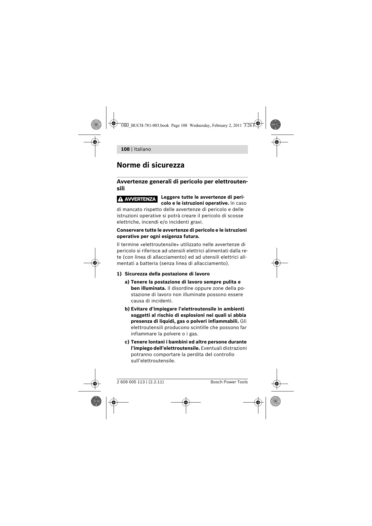 a) Tenere la postazione di lavoro sempre pulita e ben illuminata. Il disordine oppure zone della postazione di lavoro non illuminate possono essere causa di incidenti. b) Evitare d’impiegare l’elettroutensile in ambienti soggetti al rischio di esplosioni nei quali si abbia presenza di liquidi, gas o polveri infiammabili. Gli elettroutensili producono scintille che possono far infiammare la polvere o i gas. c) Tenere lontani i bambini ed altre persone durante l’impiego dell’elettroutensile. Eventuali distrazioni potranno comportare la perdita del controllo sull’elettroutensile. 2 609 005 113 | (2.2.11) Bosch Power Tools OBJ_BUCH-781-003.book Page 109 Wednesday, February 2, 2011 3:26 PM Italiano | 109