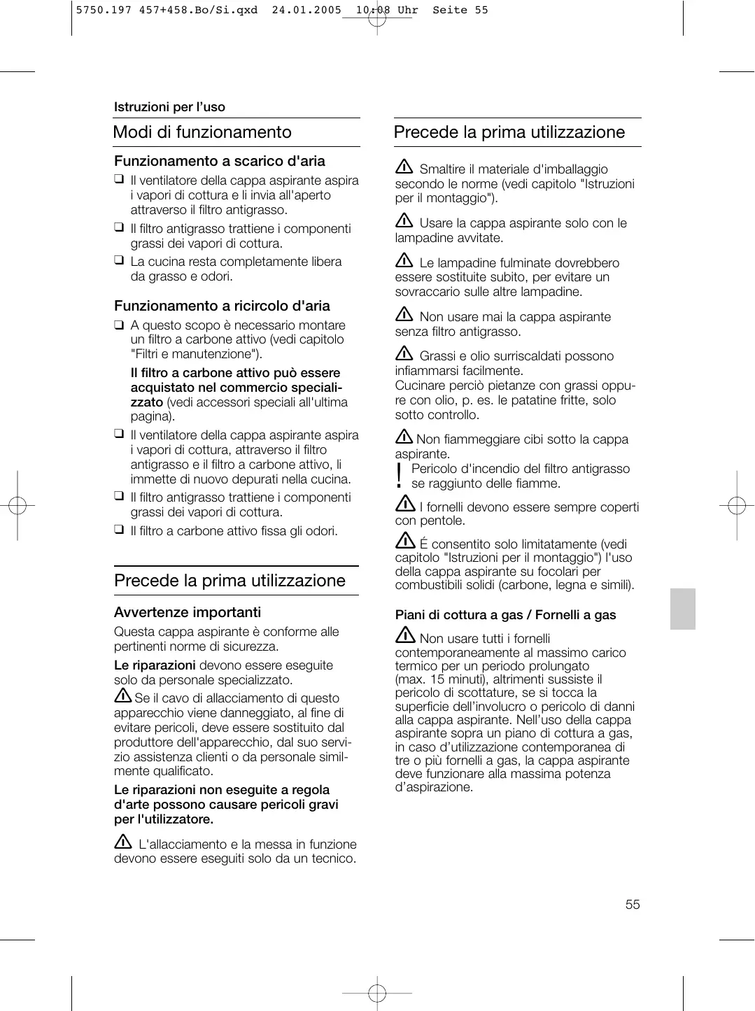 10:08 Uhr Seite 55 Istruzioni per l’uso Modi di funzionamento Precede la prima utilizzazione Funzionamento a scarico d'aria Smaltire il materiale d'imballaggio secondo le norme (vedi capitolo "Istruzioni per il montaggio"). ❑ Il ventilatore della cappa aspirante aspira i vapori di cottura e li invia all'aperto attraverso il filtro antigrasso. ❑ Il filtro antigrasso trattiene i componenti grassi dei vapori di cottura. ❑ La cucina resta completamente libera da grasso e odori. Funzionamento a ricircolo d'aria ❑ A questo scopo è necessario montare un filtro a carbone attivo (vedi capitolo "Filtri e manutenzione"). Il filtro a carbone attivo può essere acquistato nel commercio specializzato (vedi accessori speciali all'ultima pagina). ❑ Il ventilatore della cappa aspirante aspira i vapori di cottura, attraverso il filtro antigrasso e il filtro a carbone attivo, li immette di nuovo depurati nella cucina. ❑ Il filtro antigrasso trattiene i componenti grassi dei vapori di cottura. ❑ Il filtro a carbone attivo fissa gli odori. Usare la cappa aspirante solo con le lampadine avvitate. Le lampadine fulminate dovrebbero essere sostituite subito, per evitare un sovraccario sulle altre lampadine. Non usare mai la cappa aspirante senza filtro antigrasso. Grassi e olio surriscaldati possono infiammarsi facilmente. Cucinare perciò pietanze con grassi oppure con olio, p. es. le patatine fritte, solo sotto controllo. Non fiammeggiare cibi sotto la cappa aspirante. Pericolo d'incendio del filtro antigrasso se raggiunto delle fiamme.