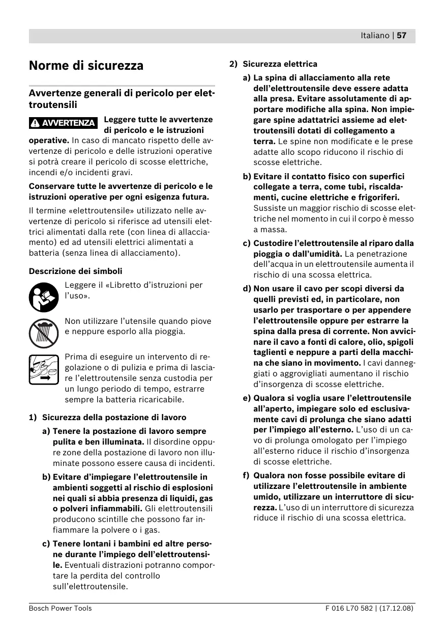 a) La spina di allacciamento alla rete dell’elettroutensile deve essere adatta alla presa. Evitare assolutamente di apportare modifiche alla spina. Non impiegare spine adattatrici assieme ad elettroutensili dotati di collegamento a terra. Le spine non modificate e le prese adatte allo scopo riducono il rischio di scosse elettriche. b) Evitare il contatto fisico con superfici collegate a terra, come tubi, riscaldamenti, cucine elettriche e frigoriferi. Sussiste un maggior rischio di scosse elettriche nel momento in cui il corpo è messo a massa. c) Custodire l’elettroutensile al riparo dalla pioggia o dall’umidità. La penetrazione dell’acqua in un elettroutensile aumenta il rischio di una scossa elettrica. d) Non usare il cavo per scopi diversi da quelli previsti ed, in particolare, non usarlo per trasportare o per appendere l’elettroutensile oppure per estrarre la spina dalla presa di corrente. Non avvicinare il cavo a fonti di calore, olio, spigoli taglienti e neppure a parti della macchina che siano in movimento. I cavi danneggiati o aggrovigliati aumentano il rischio d’insorgenza di scosse elettriche. e) Qualora si voglia usare l’elettroutensile all’aperto, impiegare solo ed esclusivamente cavi di prolunga che siano adatti per l’impiego all’esterno. L’uso di un cavo di prolunga omologato per l’impiego all’esterno riduce il rischio d’insorgenza di scosse elettriche. f) Qualora non fosse possibile evitare di utilizzare l’elettroutensile in ambiente umido, utilizzare un interruttore di sicurezza. L’uso di un interruttore di sicurezza riduce il rischio di una scossa elettrica. c) Tenere lontani i bambini ed altre persone durante l’impiego dell’elettroutensile. Eventuali distrazioni potranno comportare la perdita del controllo sull’elettroutensile. Bosch Power Tools F 016 L70 582 | (17.12.08) 58 | Italiano