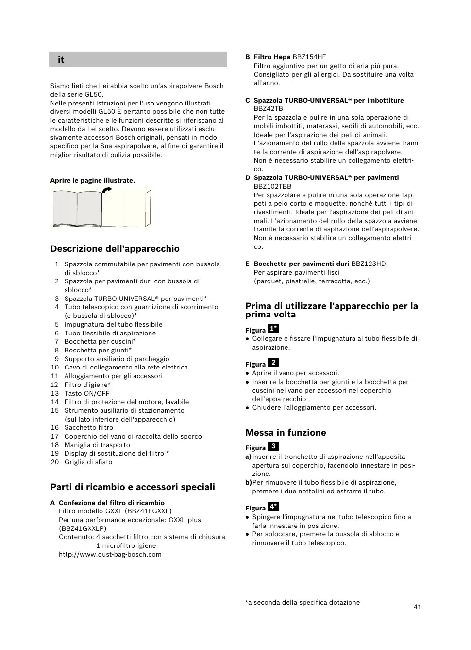 Nelle presenti Istruzioni per l'uso vengono illustrati diversi modelli GL50 è pertanto possibile che non tutte le caratteristiche e le funzioni descripte si riferiscano al modello da Lei scelto. Devono essere utilizzati esclusivamente accessori Bosch originali, pensati in modo specifico per la Sua aspirapolvere, al fine di garantire il miglior risultato di pulizia possibile.