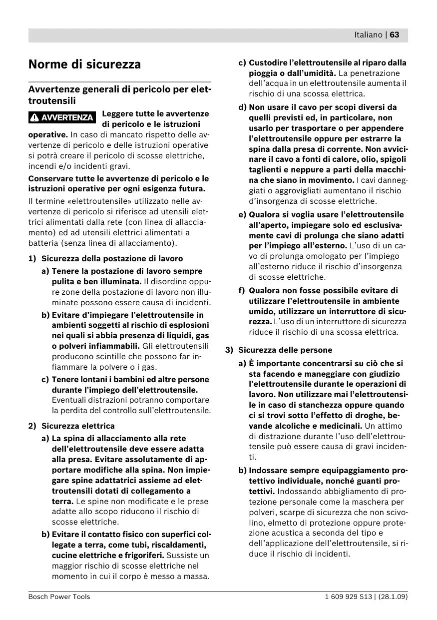 a) È importante concentrarsi su ciò che si sta facendo e maneggiare con giudizio l’elettroutensile durante le operazioni di lavoro. Non utilizzare mai l’elettroutensile in caso di stanchezza oppure quando ci si trovi sotto l’effetto di droghe, bevande alcoliche e medicinali. Un attimo di distrazione durante l’uso dell’elettroutensile può essere causa di gravi incidenti. b) Indossare sempre equipaggiamento protettivo individuale, nonché guanti protettivi. Indossando abbigliamento di protezione personale come la maschera per polveri, scarpe di sicurezza che non scivolino, elmetto di protezione oppure protezione acustica a seconda del tipo e dell’applicazione dell’elettroutensile, si riduce il rischio di incidenti. 1 609 929 S13 | (28.1.09) 64 | Italiano c) Evitare l’accensione involontaria dell’elettroutensile. Prima di collegarlo alla rete di alimentazione elettrica e/o alla batteria ricaricabile, prima di prenderlo oppure prima di iniziare a trasportarlo, assicurarsi che l’elettroutensile sia spento. Tenendo il dito sopra l’interruttore mentre si trasporta l’elettroutensile oppure collegandolo all’alimentazione di corrente con l’interruttore inserito, si vengono a creare situazioni pericolose in cui possono verificarsi seri incidenti. d) Prima di accendere l’elettroutensile togliere gli attrezzi di regolazione o la chiave inglese. Un accessorio oppure una chiave che si trovi in una parte rotante della macchina può provocare seri incidenti. e) Evitare una posizione anomala del corpo. Avere cura di mettersi in posizione sicura e di mantenere l’equilibrio in ogni situazione. In questo modo è possibile controllare meglio l’elettroutensile in caso di situazioni inaspettate. f) Indossare vestiti adeguati. Non indossare vestiti larghi, né portare bracciali e catenine. Tenere i capelli, i vestiti ed i guanti lontani da pezzi in movimento. Vestiti lenti, gioielli o capelli lunghi potranno impigliarsi in pezzi in movimento. g) In caso fosse previsto il montaggio di dispositivi di aspirazione della polvere e di raccolta, assicurarsi che gli stessi siano collegati e che vengano utilizzati correttamente. L’utilizzo di un’aspirazione polvere può ridurre lo svilupparsi di situazioni pericolose dovute alla polvere.