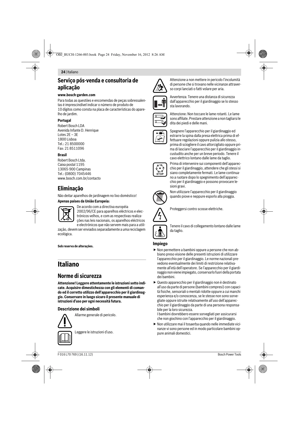 Busca de erros STOP Sintomas O motor não arranca Solução Controlar e ligar Utilizar uma outra tomada Controlar o cabo e substituir se estiver danificado Substituir o fusível Controlar o lado de baixo do aparelho de jardinagem e eliminar a obstrução, se for necessário (sempre usar luvas de jardinagem) A protecção motor foi activada Deixar o motor arrefecer e aumentar a altura de corte A altura de corte não é suficiente para as Aumentar a altura de corte condições actuais O aparelho de jardinagem Cabo de extensão danificado Controlar o cabo e substituir se estiver danificado funciona com interrupções A cablagem interna do aparelho de jardi- Dirija-se a uma oficina de serviço pós-venda nagem está com defeito A protecção motor foi activada Deixar o motor arrefecer e aumentar a altura de corte O aparelho de jardinagem Altura de corte pequena demais Aumentar a altura de corte produz um resultado de As lâminas estão embotadas Substituir a lâmina corte irregular É possível que haja uma obstrução Controlar o lado de baixo do aparelho de jardinagem e e/ou eliminar a obstrução, se for necessário (sempre usar O motor trabalha com difiluvas de jardinagem) culdades Lâmina montada do lado errado Montar a lâmina do lado certo Após ligar o aparelho de jar- A lâmina é impedida pela relva Desligar o aparelho de jardinagem dinagem, a lâmina de corte Remover a obstrução (sempre usar luvas de jardinagem) não gira Porca/parafuso da lâmina soltos Apertar porca/parafuso da lâmina (17 Nm) Fortes vibrações/ruídos Porca/parafuso da lâmina soltos Apertar porca/parafuso da lâmina (17 Nm) Lâmina danificada Substituir a lâmina Bosch Power Tools Possível causa Falta tensão de rede Tomada de rede eléctrica com defeito Cabo de extensão danificado O fusível foi accionado É possível que haja uma obstrução F 016 L70 769 | (16.11.12) OBJ_BUCH-1266-003.book Page 24 Friday, November 16, 2012 8:26 AM 24 | Italiano Serviço pós-venda e consultoria de aplicação Attenzione a non mettere in pericolo l’incolumità di persone che si trovano nelle vicinanze attraverso corpi lanciati o fatti volare per aria. www.bosch-garden.com Para todas as questões e encomendas de peças sobressalentas é imprescindível indicar o número de produto de 10 dígitos como consta na placa de características do aparelho de jardim. Avvertenza: Tenere una distanza di sicurezza dall’apparecchio per il giardinaggio se lo stesso sta lavorando. Attenzione: Non toccare le lame rotanti. Le lame sono affilate. Prestare attenzione a non tagliarsi le dita dei piedi e delle mani. Portugal Robert Bosch LDA Avenida Infante D. Henrique Lotes 2E – 3E 1800 Lisboa Tel.: 21 8500000 Fax: 21 8511096 Spegnere l’apparecchio per il giardinaggio ed estrarre la spina dalla presa elettrica prima di effettuare regolazioni oppure pulizia allo stesso, prima di sciogliere il cavo attorcigliato oppure prima di lasciare l’apparecchio per il giardinaggio incustudito anche per un breve periodo. Tenere il cavo elettrico lontano dalle lame da taglio. Prima di intervenire sui componenti dell’apparecchio per il giardinaggio, attendere che gli stessi si siano completamente fermati. Le lame continuano a ruotare dopo lo spegnimento dell’apparecchio per il giardinaggio e possono provocare lesioni gravi. Non utilizzare l’apparecchio per il giardinaggio quando piove e neppure esporlo alla pioggia. Brasil Robert Bosch Ltda. Caixa postal 1195 13065-900 Campinas Tel.: (0800) 7045446 www.bosch.com.br/contacto Eliminação Não deitar aparelhos de jardinagem no lixo doméstico! Apenas países da União Europeia: De acordo com a directiva européia 2002/96/CE para aparelhos eléctricos e electrónicos velhos, e com as respectivas realizações nas leis nacionais, os aparelhos eléctricos e electrónicos que não servem mais para a utilização, devem ser enviados separadamente a uma reciclagem ecológica. Sob reserva de alterações. Italiano Norme di sicurezza Attenzione! Leggere attentamente le istruzioni sotto indicate. Acquisire dimestichezza con gli elementi di comando ed il corretto utilizzo dell’apparecchio per il giardinaggio. Conservare in luogo sicuro il presente manuale di istruzioni d’uso per ogni necessità futura. Descrizione dei simboli Allarme generale di pericolo. Leggere le istruzioni d’uso. F 016 L70 769 | (16.11.12) Proteggersi contro scosse elettriche. Tenere il cavo di collegamento lontano dalle lame da taglio. Impiego Non permettere a bambini oppure a persone che non abbiano preso visione delle presenti istruzioni di utilizzare l’apparecchio per il giardinaggio. Le norme nazionali prevedono eventualmente dei limiti di restrizione relativamente all’età dell’operatore. Se l’apparecchio per il giardinaggio non viene impiegato, conservarlo fuori della portata dei bambini. Questo apparecchio per il giardinaggio non è destinato all’uso da parte di persone (bambini compresi) con capacità fisiche, sensoriali o mentali ridotte oppure a cui manchi esperienza e/o conoscenza, se le stesse non sono sorvegliate oppure istruite relativamente all’uso dell’apparecchio per il giardinaggio da parte di una persona responsabile per la loro sicurezza. I bambini dovrebbero essere sorvegliati per assicurarsi che non giochino con l’apparecchio per il giardinaggio. Non utilizzare mai il tosaerba quando nelle immediate vicinanze vi sono persone ed in modo particolare bambini oppure animali domestici. Bosch Power Tools OBJ_BUCH-1266-003.book Page 25 Friday, November 16, 2012 8:26 AM Italiano | 25 L’operatore o l’utente è responsabile degli incidenti o dei rischi in cui possono incorrere le altre persone o le loro proprietà. Mai utilizzare l’apparecchio per il giardinaggio a piedi nudi né calzando sandali aperti. Portare sempre robuste scarpe di sicurezza e pantaloni lunghi. Ispezionare accuratamente la superficie da lavorare ed avere cura di rimuovere eventuali pietre, bastoni, fili metallici, ossi 