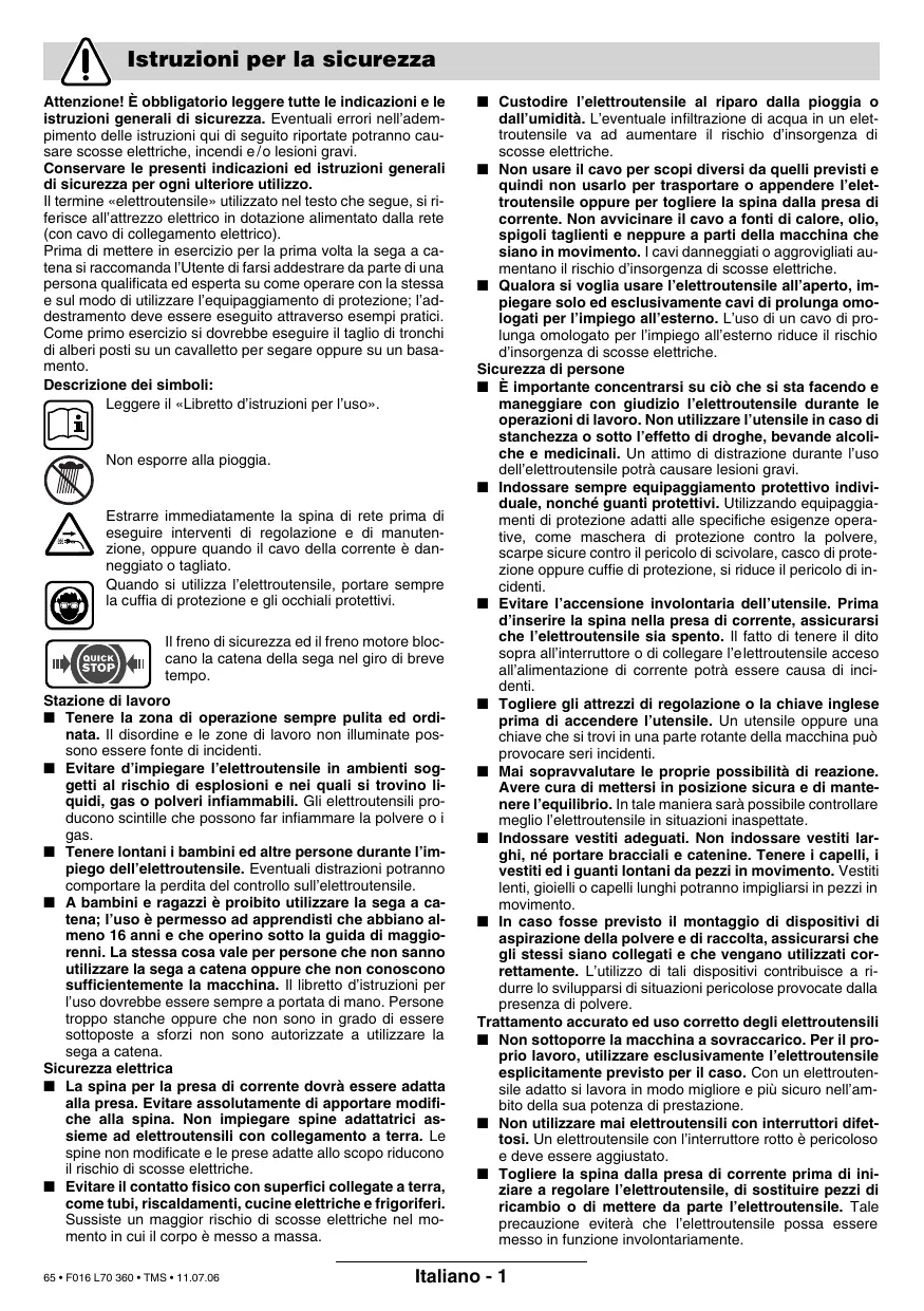 Prova di omologazione num. 2088141.01 CE attraverso stazione di collaudo notificata num. 0344. CE 2000/14: Il livello della potenza sonora L WA garantito è minore di 104 dB (A). Procedimento di valutazione della conformità secondo appendice V. Leinfelden, 01.09.2005. Dr. Egbert Schneider Als u de machine wilt uitschakelen, laat u de aan/ uit-schakelaar 2 los. Na het zagen mag de kettingzaag niet worden gestopt door het bedienen van de voorste handbescherming (activeren van de terugslagrem).